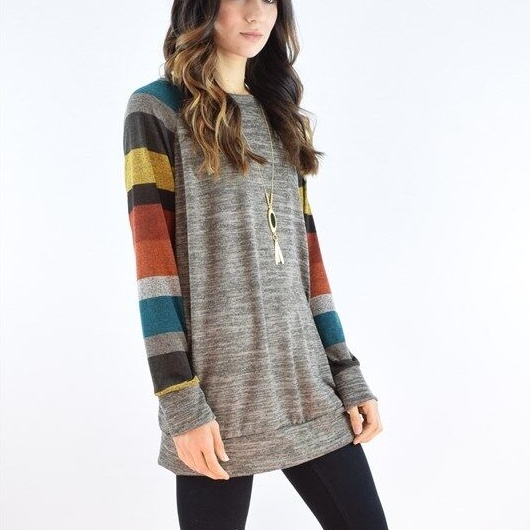 袖にくすみカラーのカラフルなボーダーが入ったトップスです。