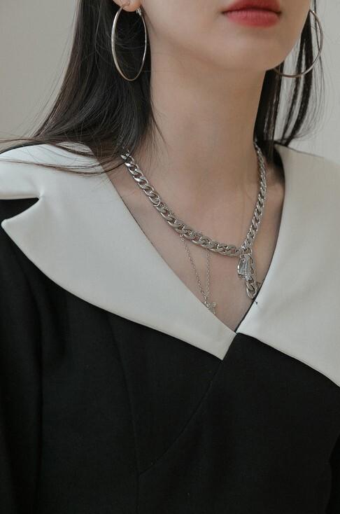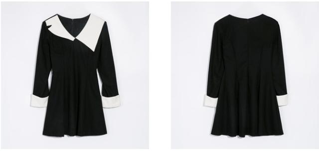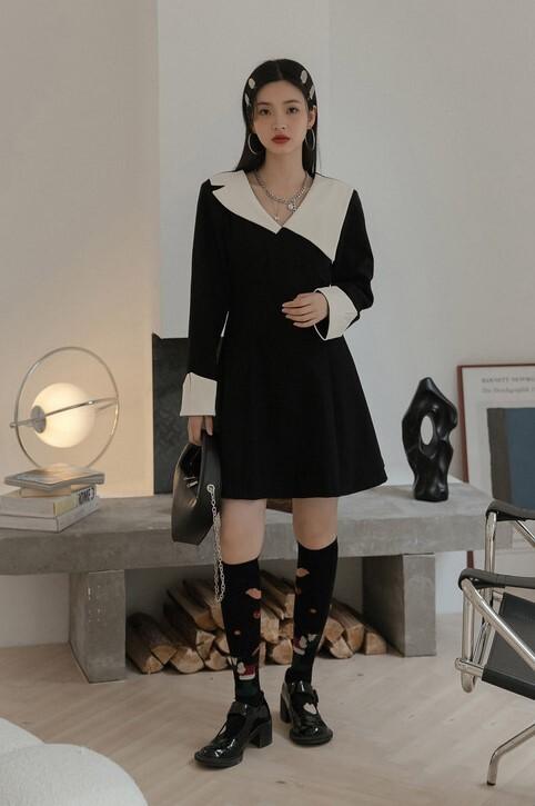襟のデザインが目を引くブラックワンピース。