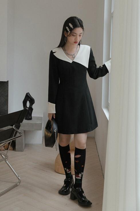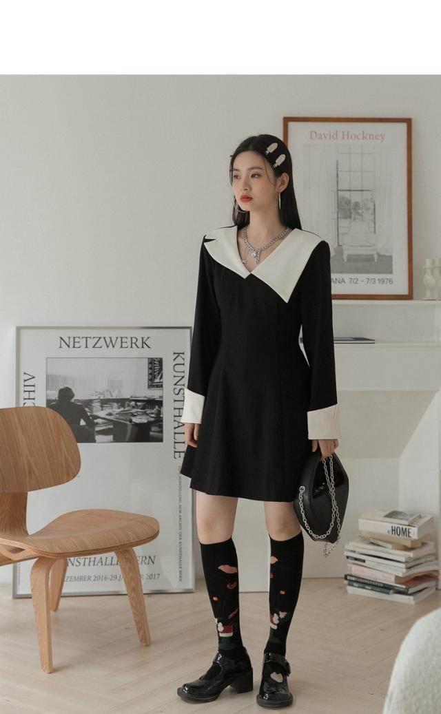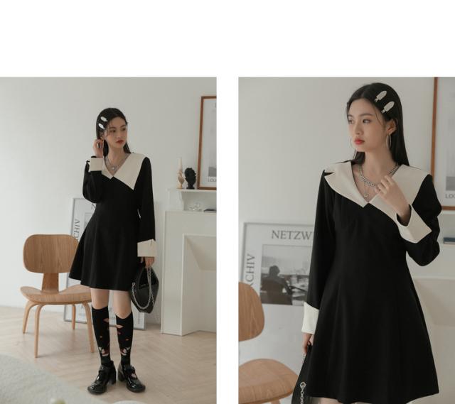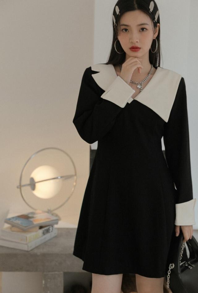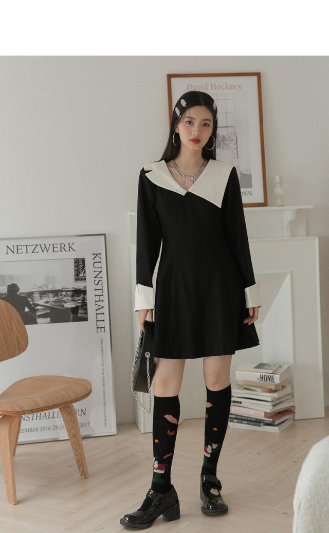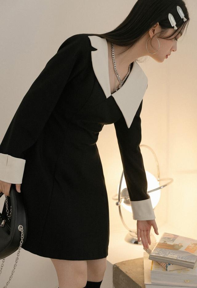 ワンピース 襟デザイン 膝上 ミニ丈 袖あり 長袖 薄手 かわいい 大人可愛い きれいめ 上品 おしゃれ 大人可愛い 個性的 モダン 主役級 二次会 披露宴 10代 20代 30代 レディース 女性用 デート お出かけ 女子会 パーティー イベント ホテル ファッション コーデ スタイル モテ サイズ S M ブラック