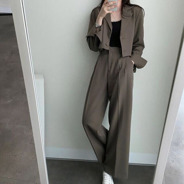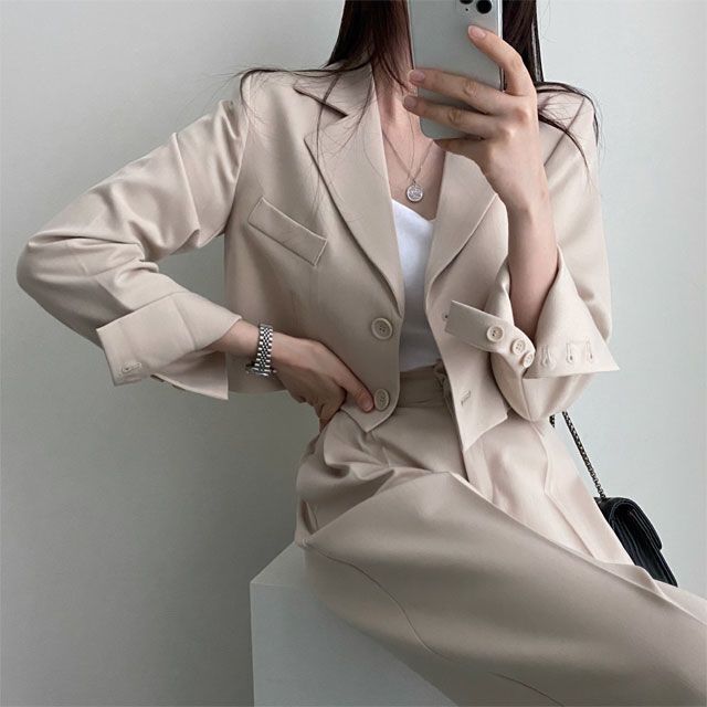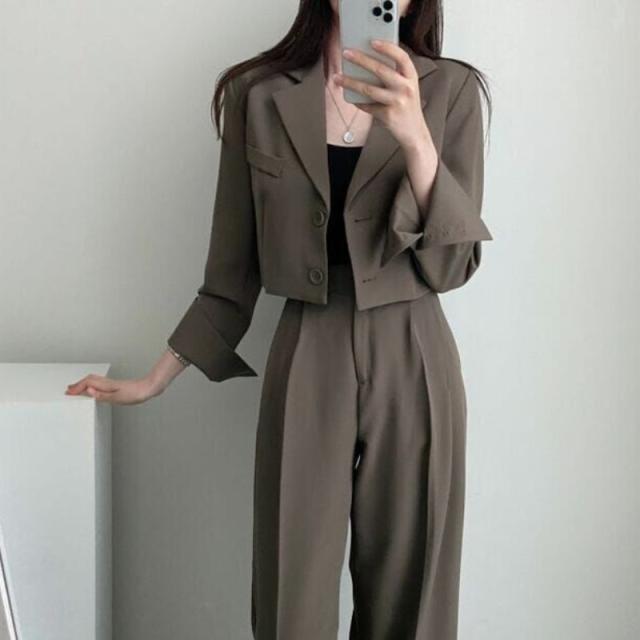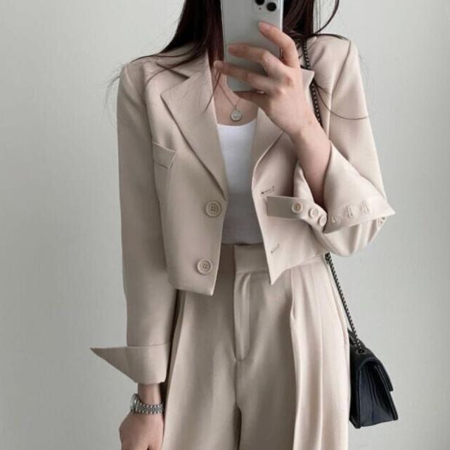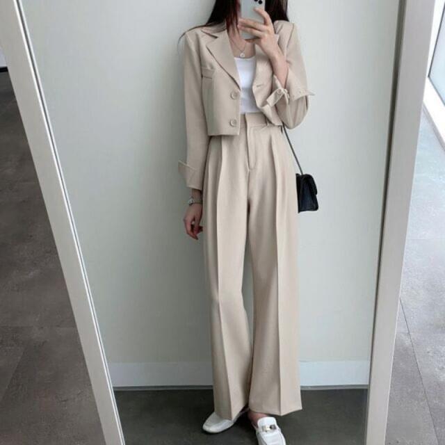 ショート丈のジャケットとワイドパンツのセットアップ。
