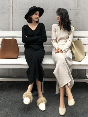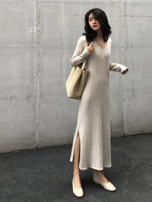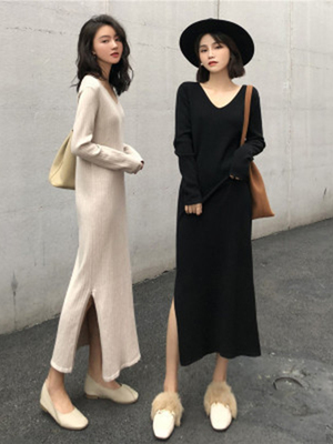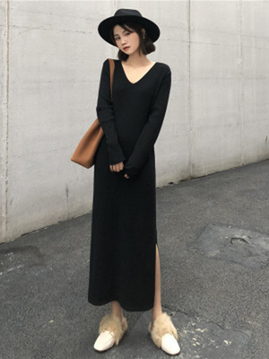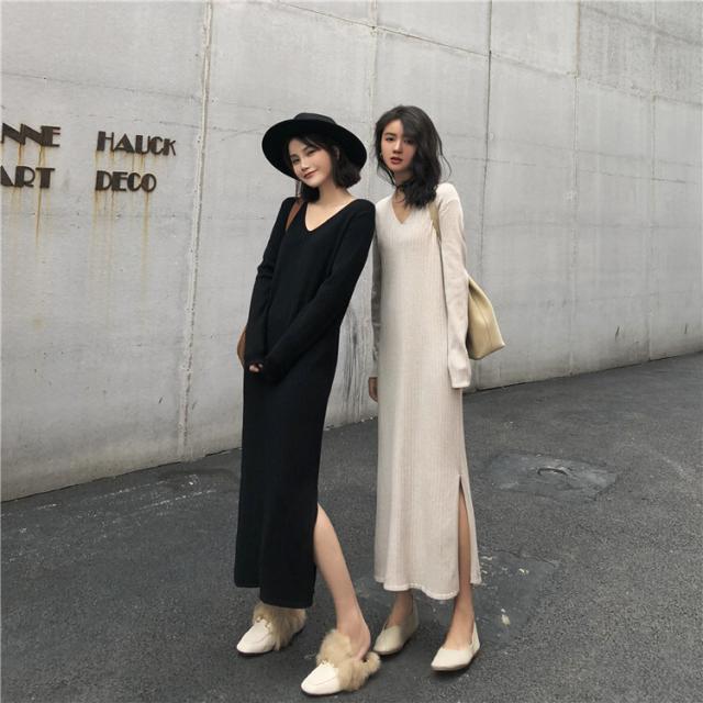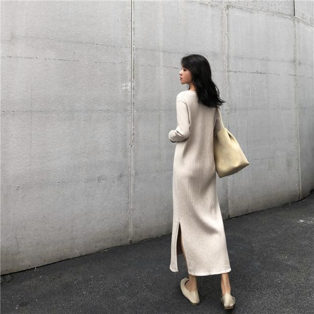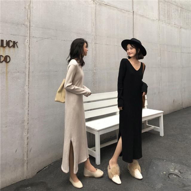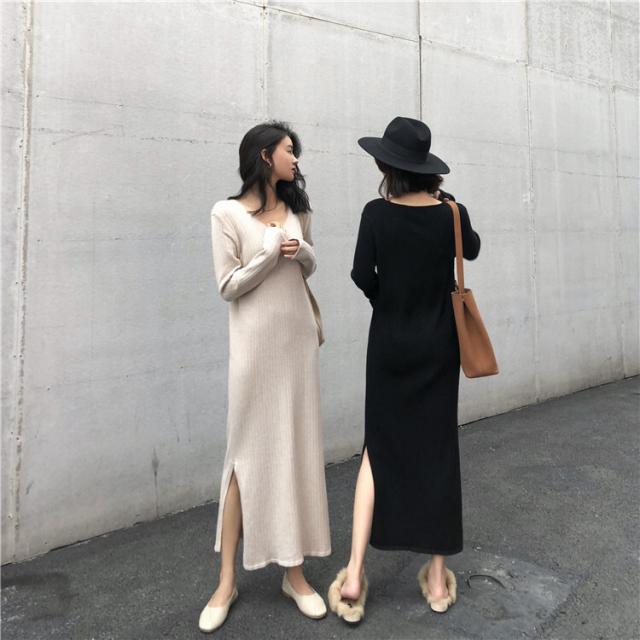 ニットワンピース スリット 秋冬 ロングワンピース レディース ロング丈 Vネック 色っぽ 細身 膝下 マキシワンピース マキシ丈 無地 シンプル 20代 30代 40代 50代 セクシー 大人可愛い カジュアル かわいい 着回し Iライン ストレート 美脚