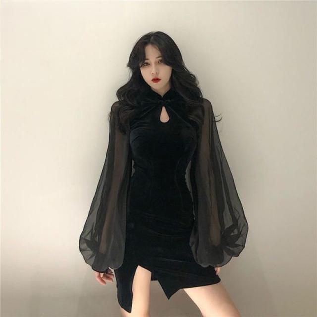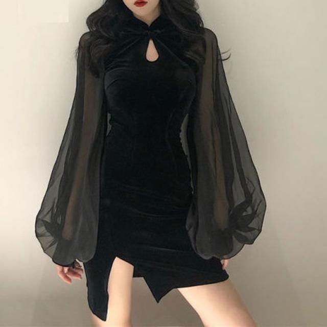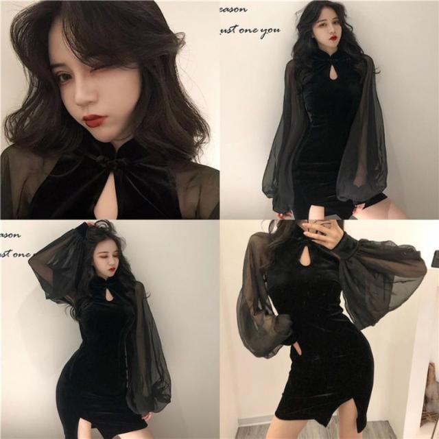 ベロアワンピース ワンピース レディース ミニドレス シアースリーブ ハイネック ドロップカット 長袖 ボリュームスリーブ スリット入り レース袖 ショート丈 お呼ばれワンピース シースルー チャイナドレス 異素材 セクシー 黒 ブラック ワンピドレス 大人可愛い きれいめ