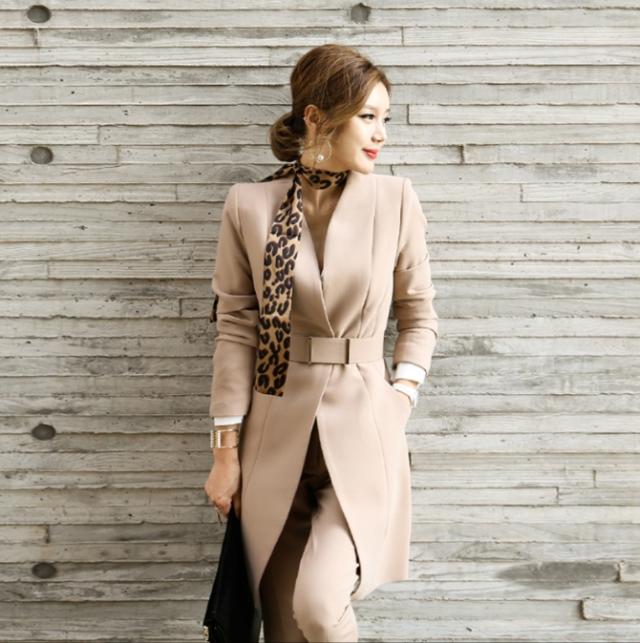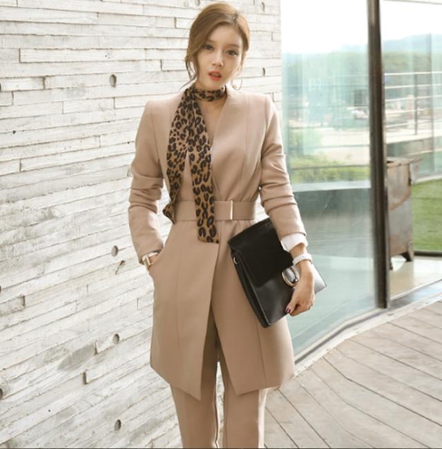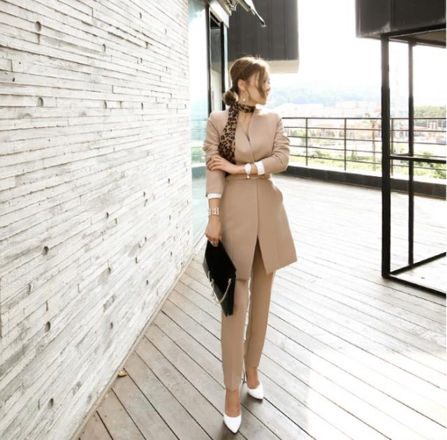 スーツ スキニーパンツ アンクル丈 袖あり 長袖 襟なし スリム ベルト シルクスカーフ 3点セット お得 きれいめ シンプル 大人 上品 お洒落 かっこいい こなれ感 クール モード系 モダン 存在感 フォーマル スパイシー 無地 ヒョウ柄 秋 冬 入学式 卒業式 謝恩会 20代 30代 40代 レディース 女性用 ママ OL パーティー ホテル レストラン 韓国 オルチャン ファッション スタイル トレンド サイズ S M L XL 秋カラー ピンクベージュ 黒