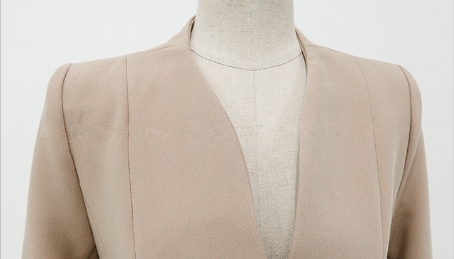 上品な秋カラーのノーカラージャケットと細身のパンツスーツ