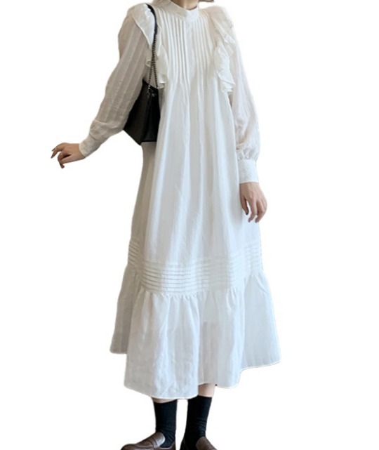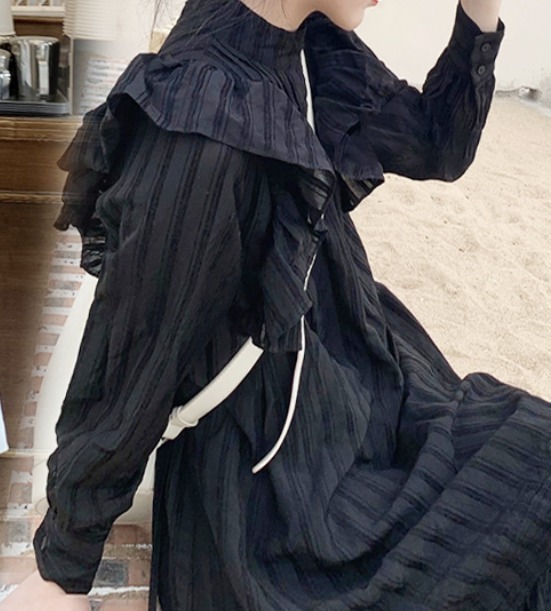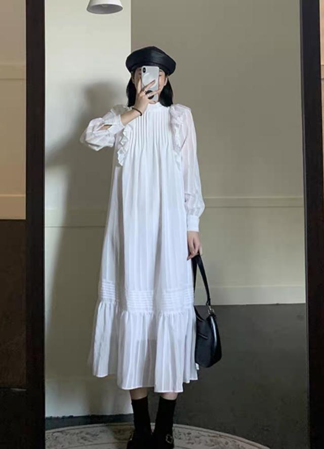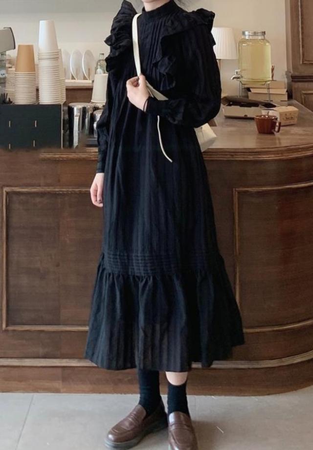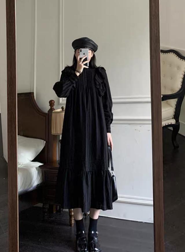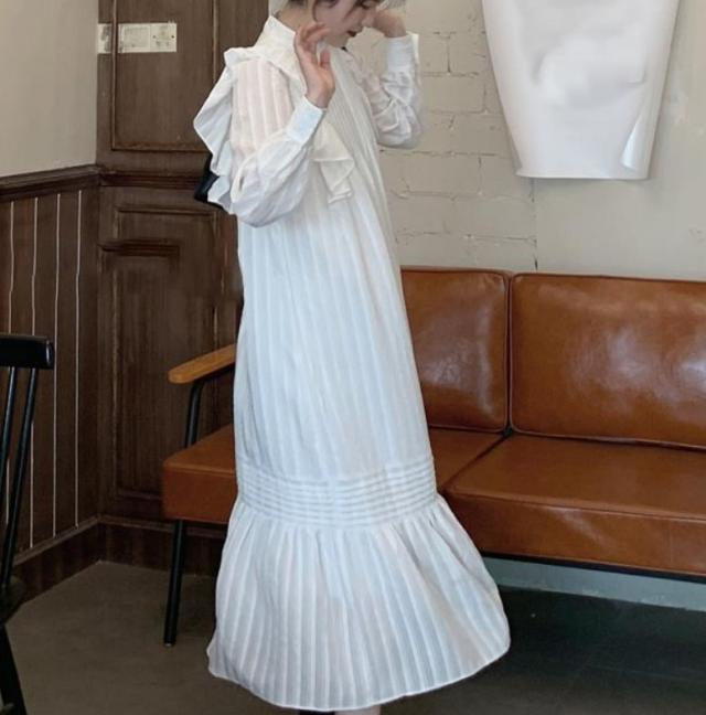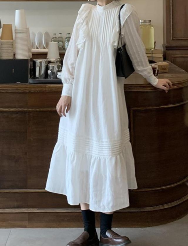 ラッフルフリル ドレス ロング丈 Aライン ティアード おしゃれ 肩フリル かわいい たっぷりフリル シャツワンピ チュニック ラブリー カジュアル シーズンレス レディース フレンチガーリー スタイルアップ ロマンティックコーデ ゆったり 無地 ホワイト ブラック