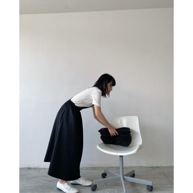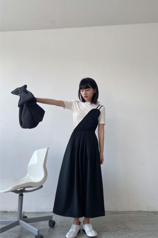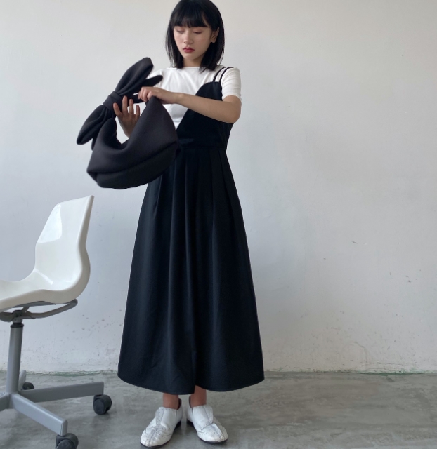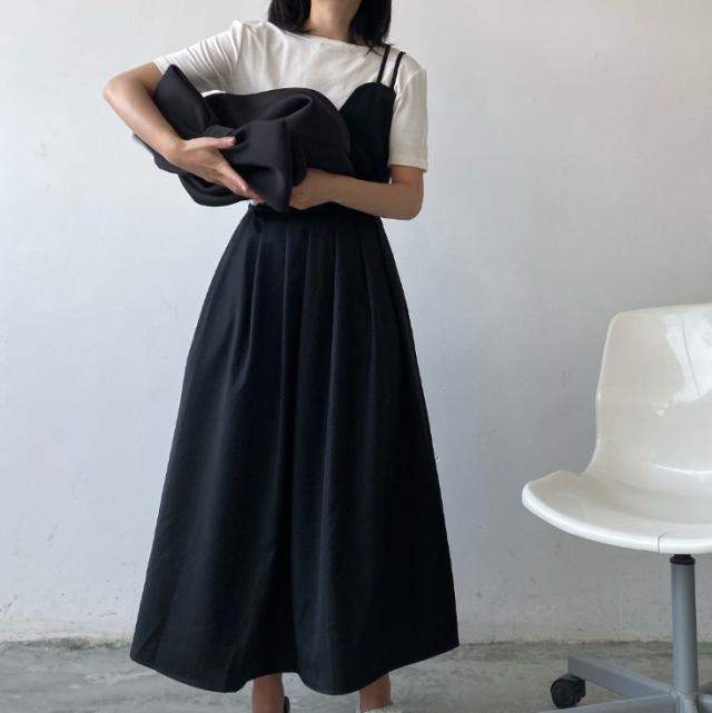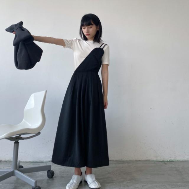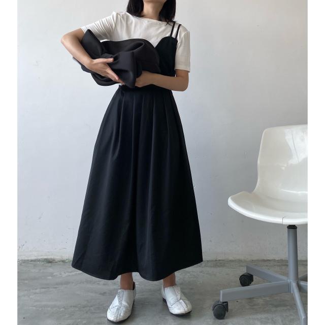 キャミソールワンピース ワンピース 白シャツ 袖なし フレア 切り替えデザイン シンプル こなれ感 個性的 モード系 無地 オールシーズン お出かけ 着回し 重ね着 トレンド 黒 ブラック