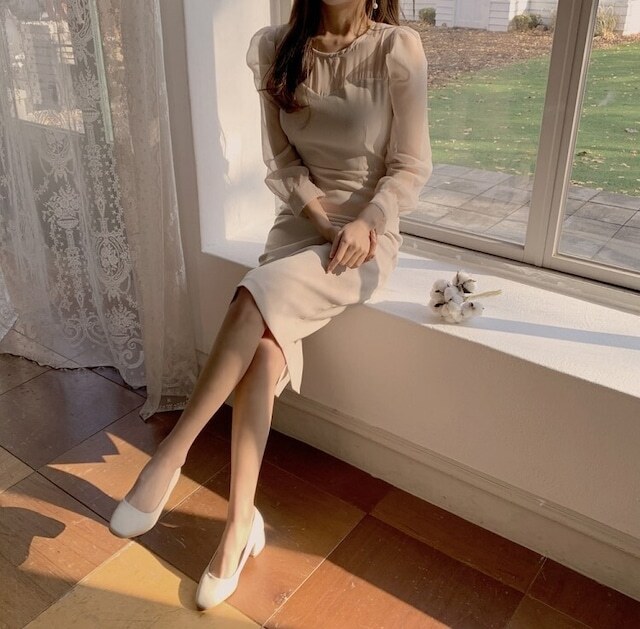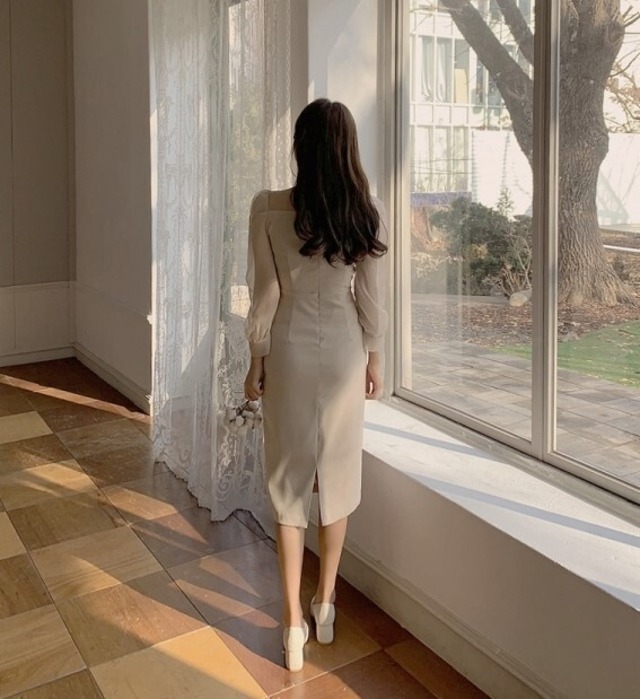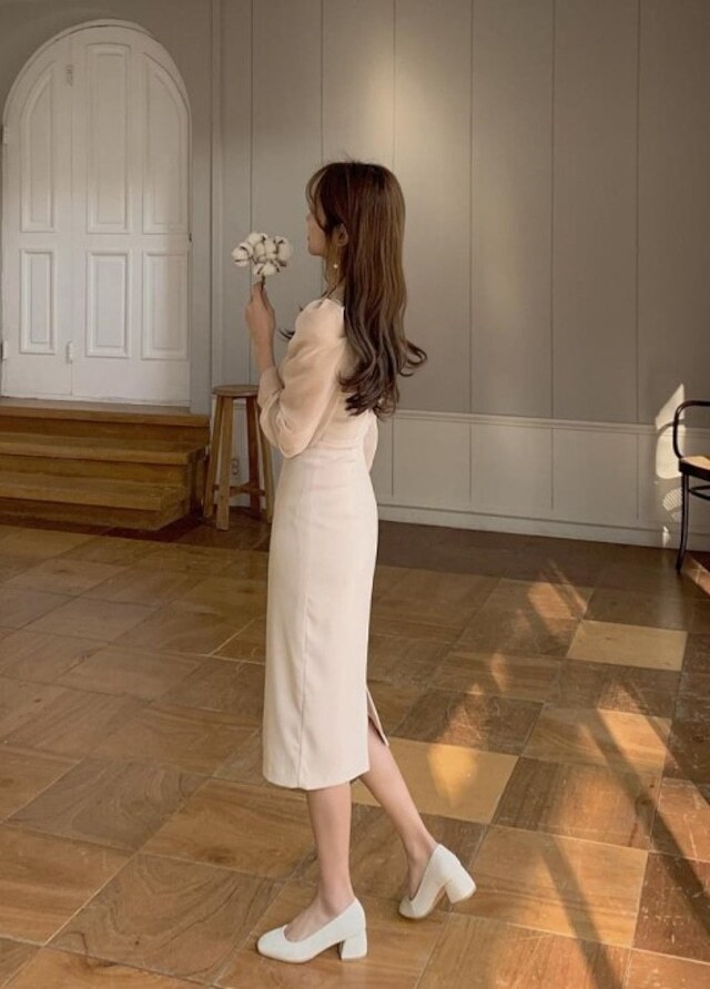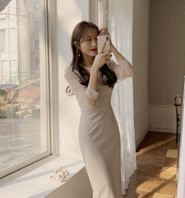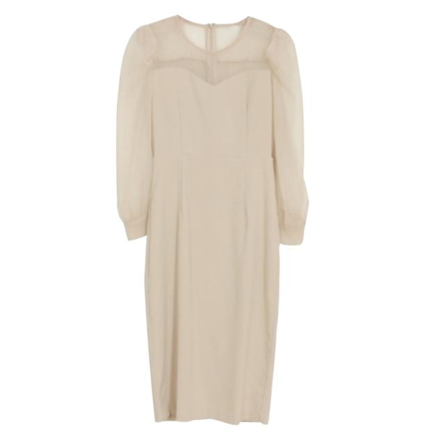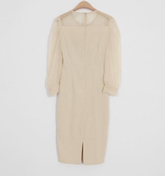 ワンピース レディース タイトワンピース 膝丈 ひざ丈 膝下 袖あり 七分袖 7分袖 パフスリーブ ラウンドネック 襟なし タイト ストレート Iライン 切り替えデザイン ドッキング シフォン バックスリット 透け感 シースルー 大人可愛い きれいめ 上品 おしゃれ お洒落 大人女子 エレガント 主役級 存在感 とろみ感 S M L XL 無地 ベージュ 春 夏 秋 誕生日 謝恩会 20代 30代 40代 デート お出かけ 女子会 パーティー 休日 イベント 美脚 脚長 モテ 韓国 オルチャン