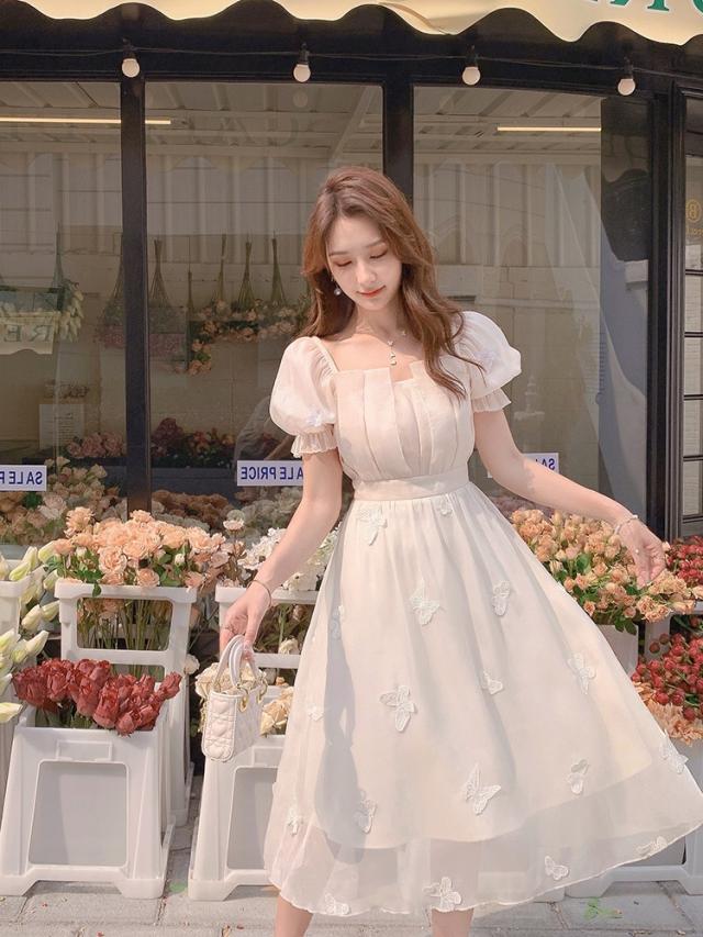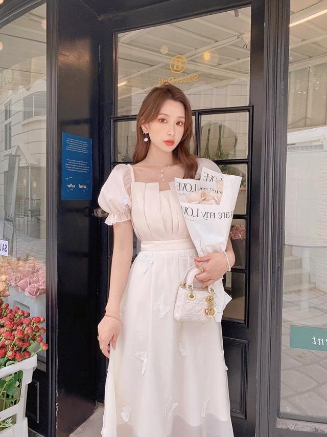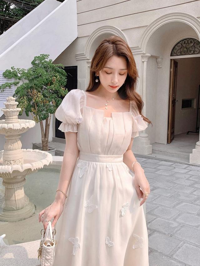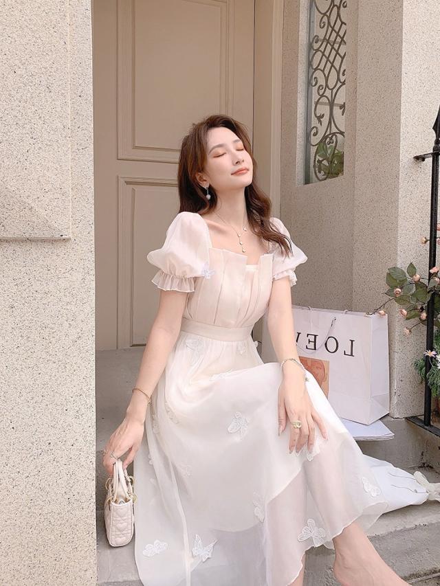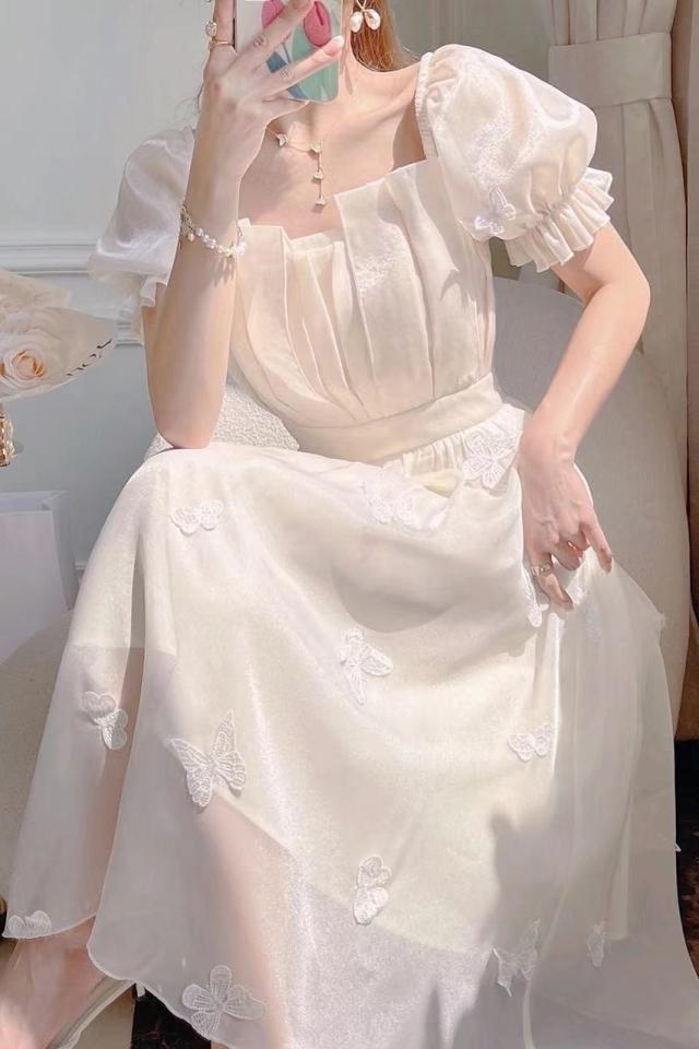 ワンピース レディース フレアワンピース ウエディング ドレス ロング 膝下 袖あり 半袖 パフスリーブ スクエアネック 襟なし フレア バタフライ Aライン 切り替えデザイン ドッキング シフォン ふわふわ 透け感 シースルー 大人可愛い きれいめ 上品 おしゃれ お洒落