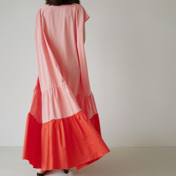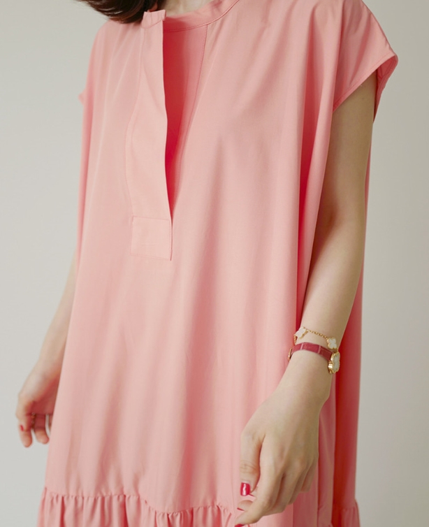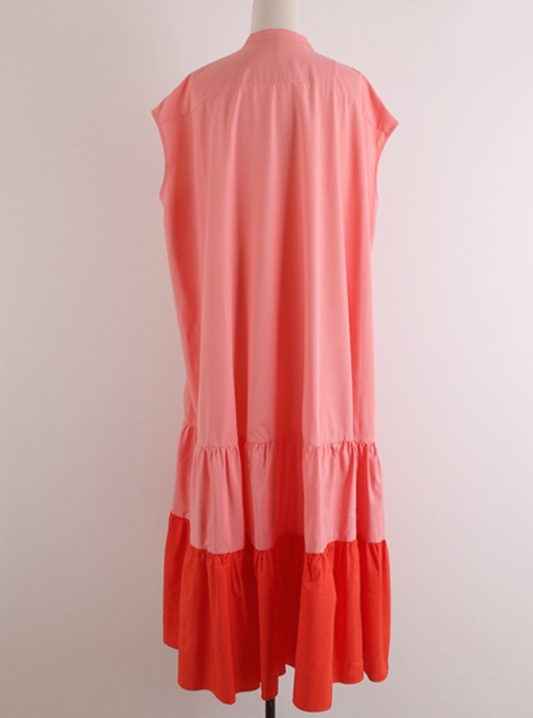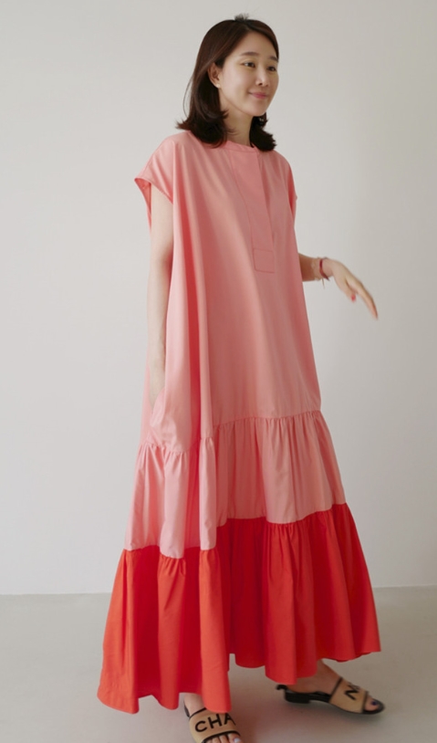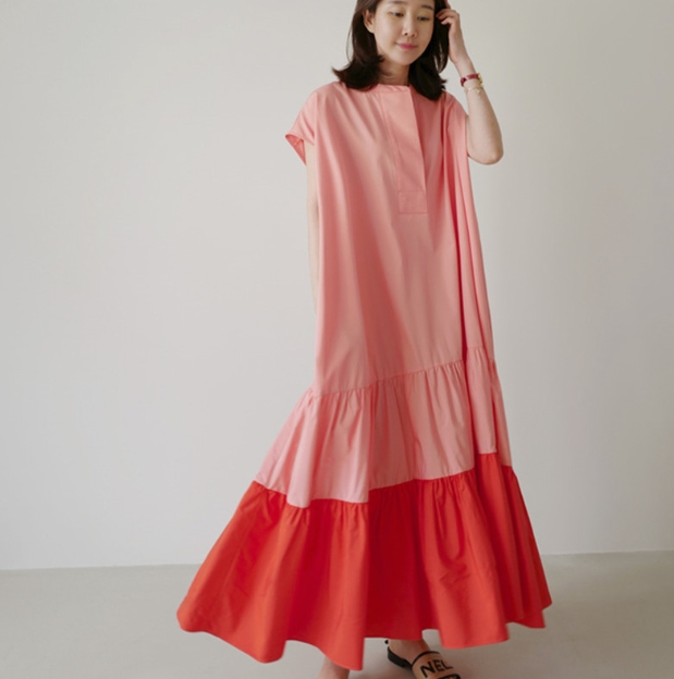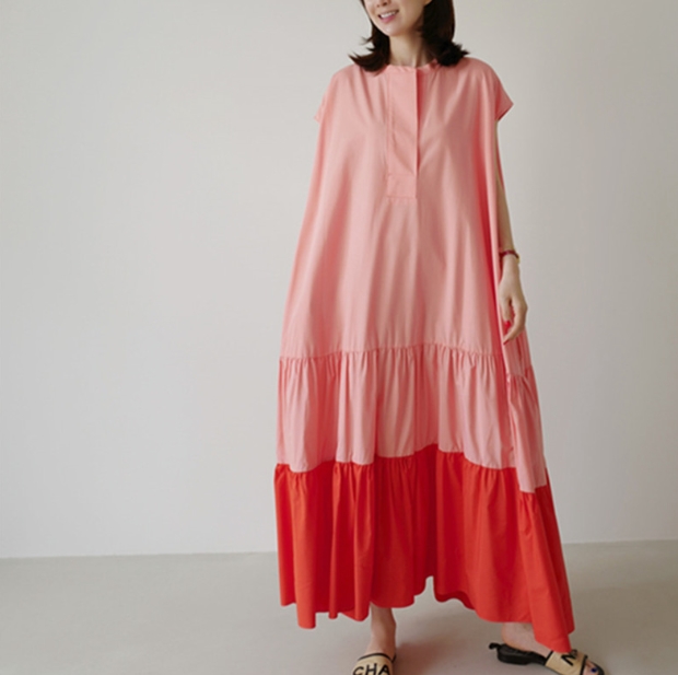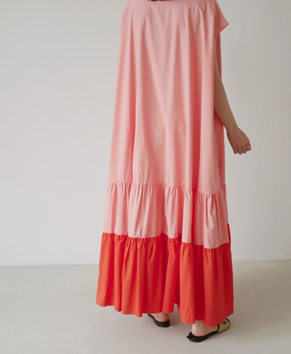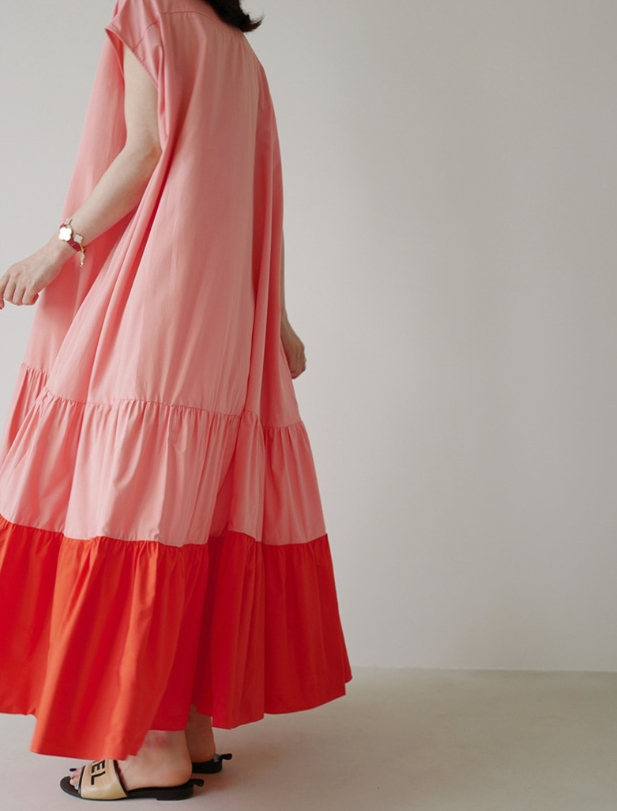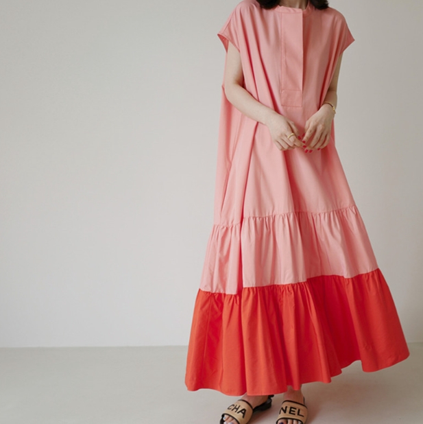 ティアードワンピース ロング丈 ノースリーブ フレンチスリーブ フレア Aライン 切り替えデザイン 綿 大人可愛い シンプル おしゃれ 存在感 無地 春 夏 デート お出かけ お泊まり 休日 リゾート 旅行 海 ピンク