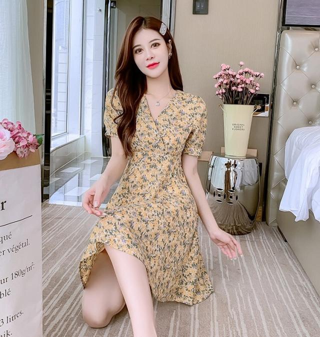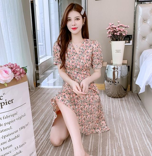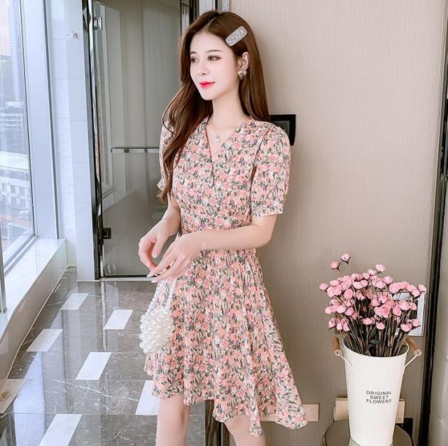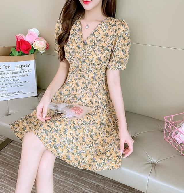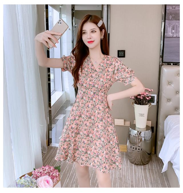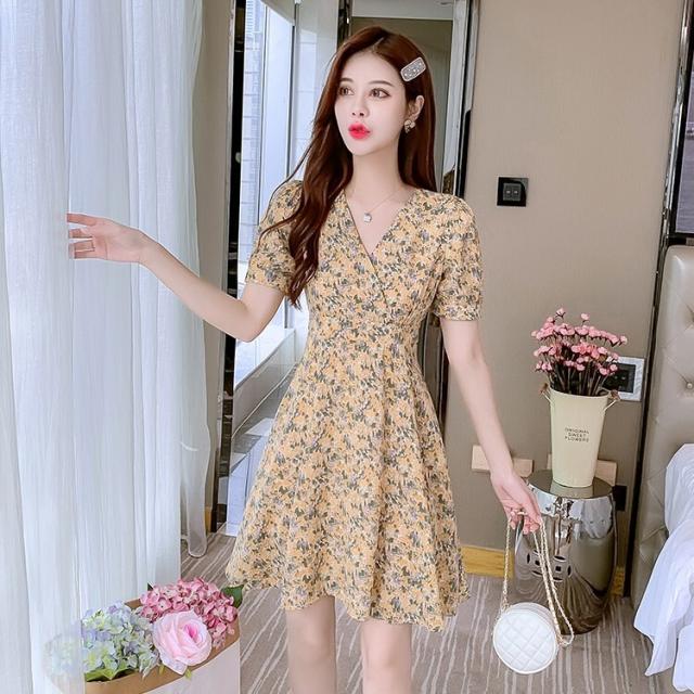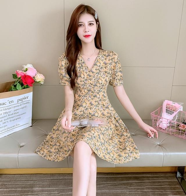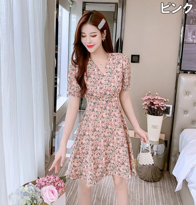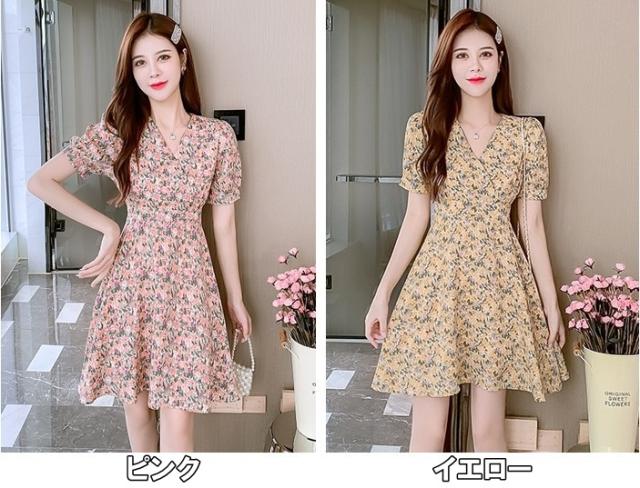 ワンピース レディース ミニワンピース S M L XL ピンク イエロー 黄色 花柄 フラワー フローラル 花 春 夏 半袖 カシュクール Vネック ハイウエスト 脚長 美脚 ミニ丈 ミニ 膝上 ショート丈 ショート フレア Aライン スタイルアップ 体型カバー フェミニン きれいめ きれカジ