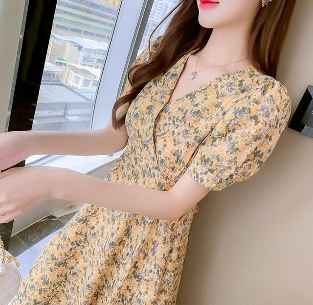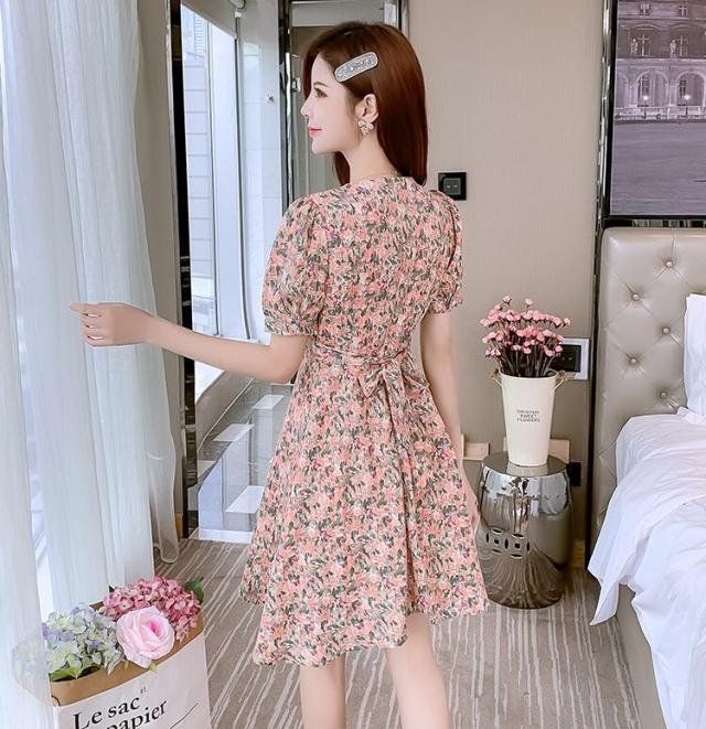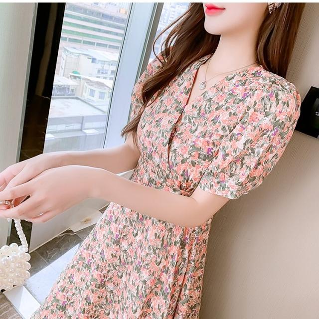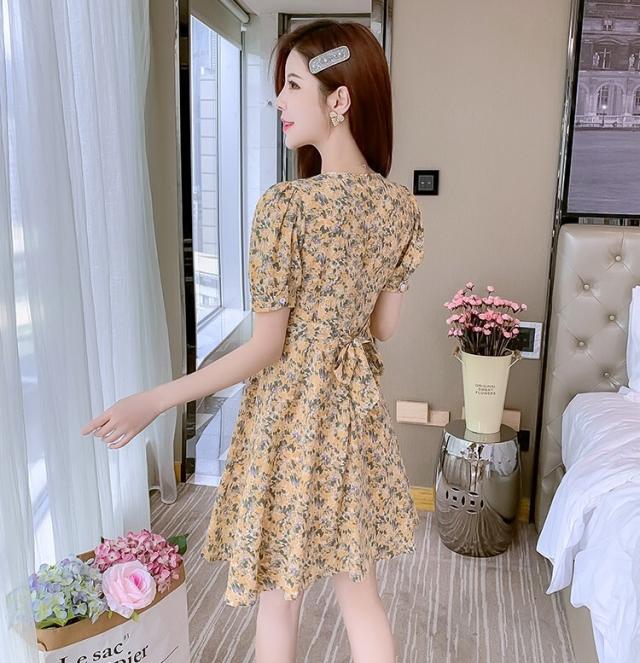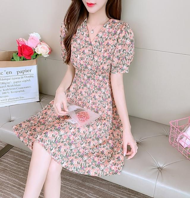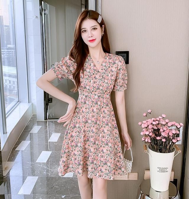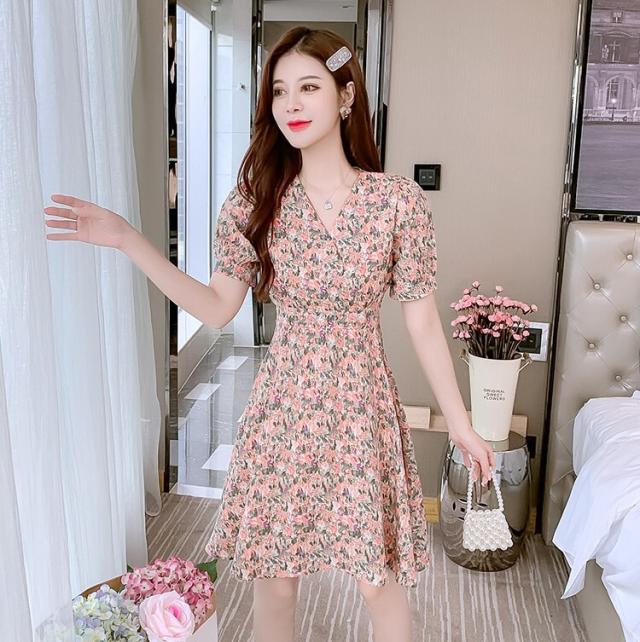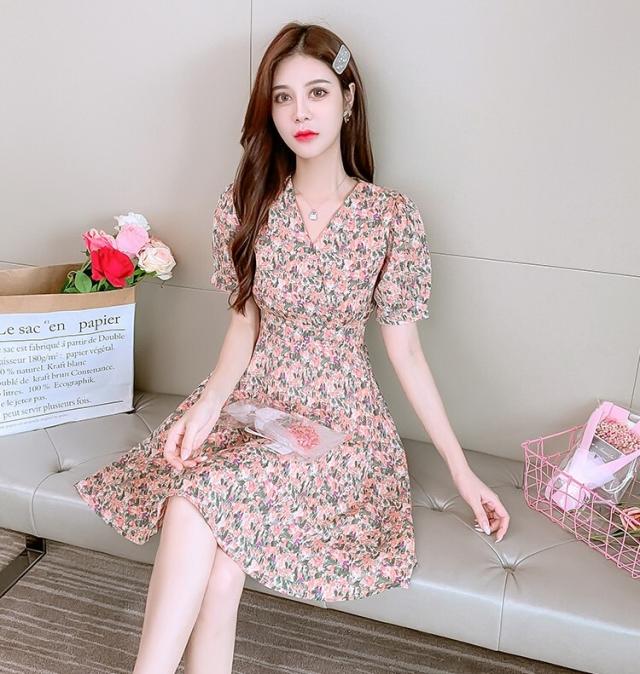 ワンピース レディース ミニワンピース S M L XL ピンク イエロー 黄色 花柄 フラワー フローラル 花 春 夏 半袖 カシュクール Vネック ハイウエスト 脚長 美脚 ミニ丈 ミニ 膝上 ショート丈 ショート フレア Aライン スタイルアップ 体型カバー フェミニン きれいめ きれカジ