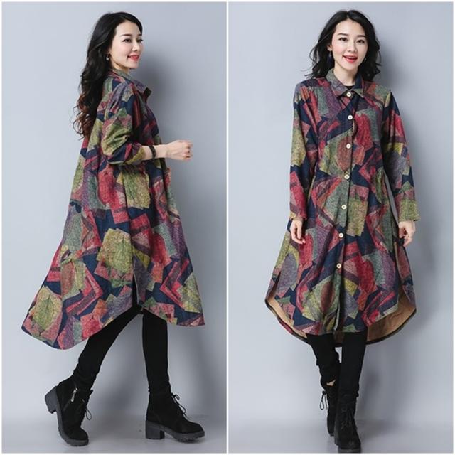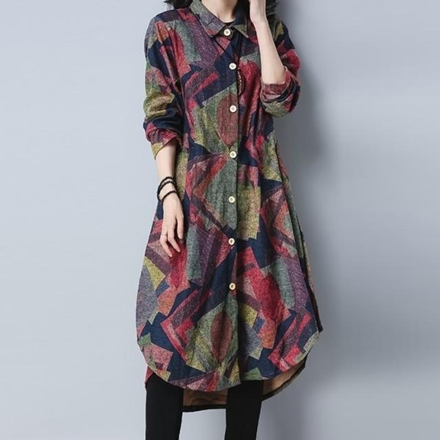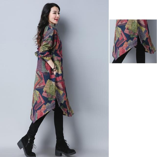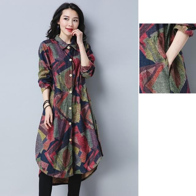 プリントシャツワンピース ワンピース レディース シャツワンピース ロングシャツ ドレス 襟付き 長袖 羽織り フレア サイドスリット 前後差丈 総柄 MIXカラー マルチカラー 幾何学柄 大人可愛い きれいめ 上品 レトロ マニッシュ ガーリー ルーズ エレガント フォーマル 春