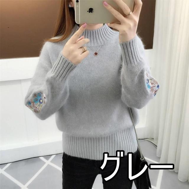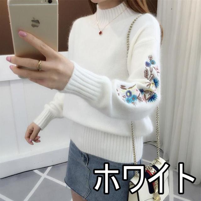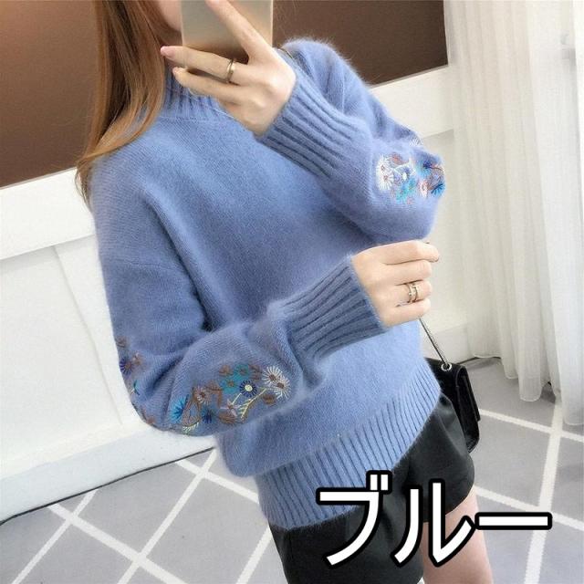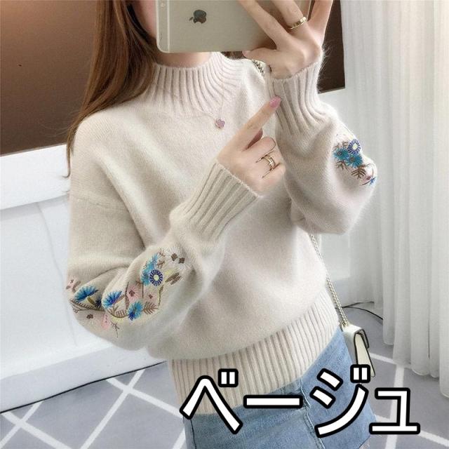 刺繍 花 ニット セーター レディース 小花 フラワー 花柄 ハイネック 体型カバー 細見え 小顔 もふもふ ふわふわ タートルネック 長袖 萌え袖 原色 くすみカラー 大きいサイズ お洒落 オシャレ かわいい 大人可愛い 30代 40代 50代 レトロ