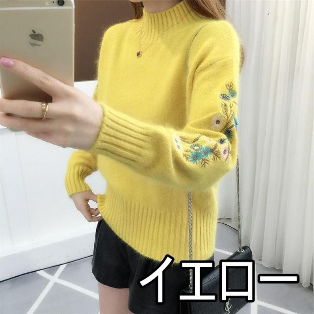 刺繍 花 ニット セーター レディース 小花 フラワー 花柄 ハイネック 体型カバー 細見え 小顔 もふもふ ふわふわ タートルネック 長袖 萌え袖 原色 くすみカラー 大きいサイズ お洒落 オシャレ かわいい 大人可愛い 30代 40代 50代 レトロ エスニック アジアン 上品 大人女子 エレガント 暖かい 緑 黄色 イエロー グリーン