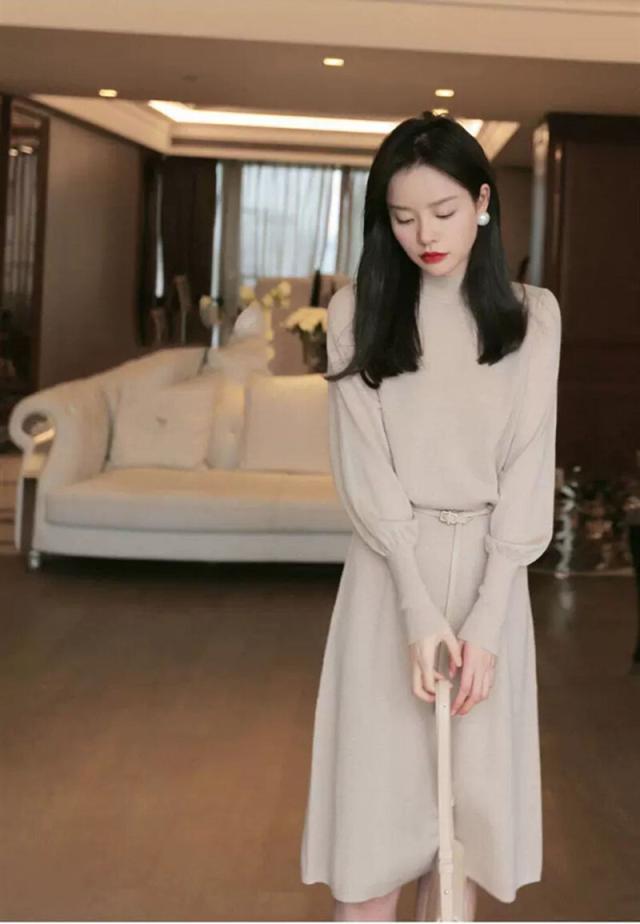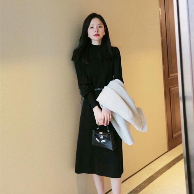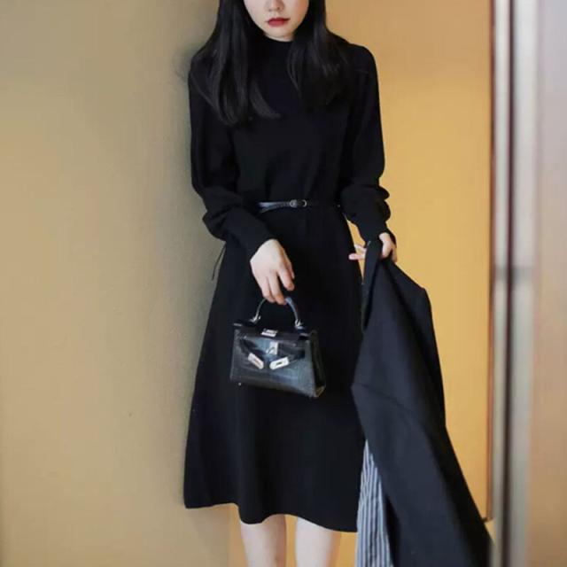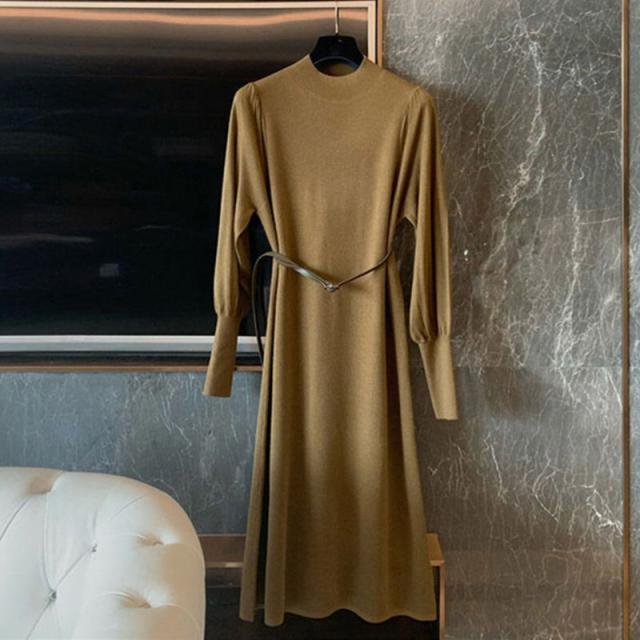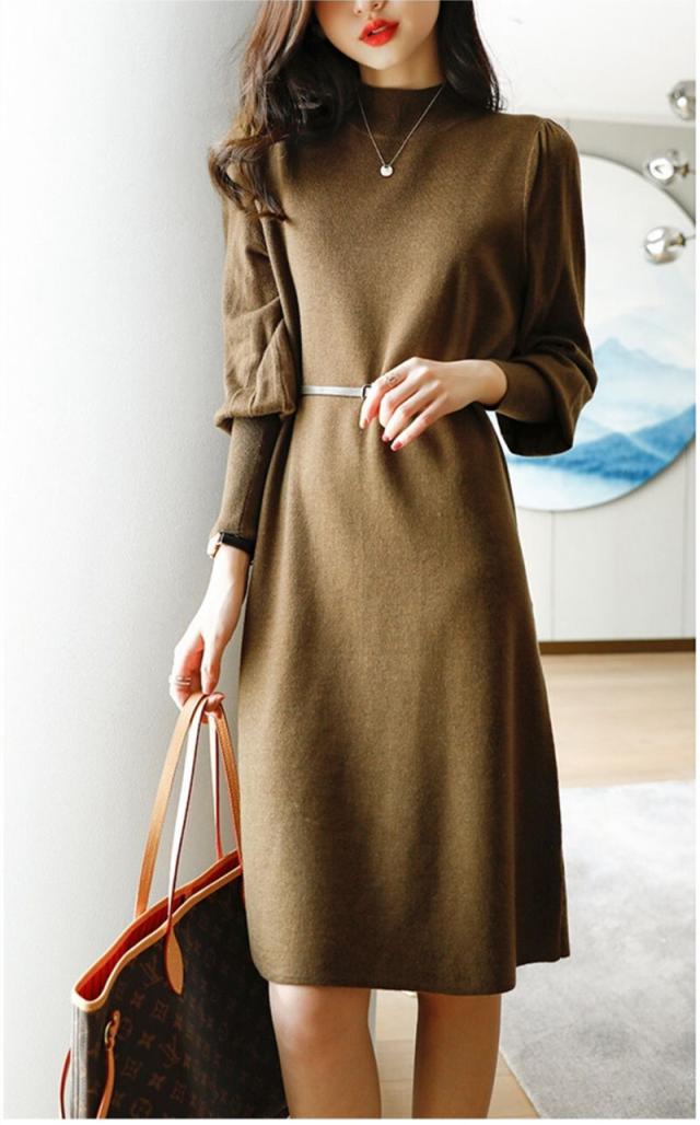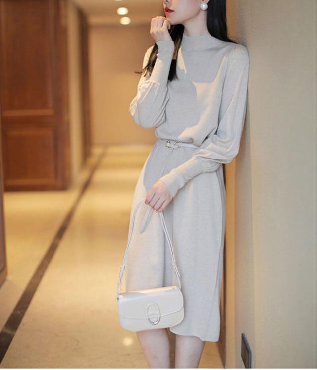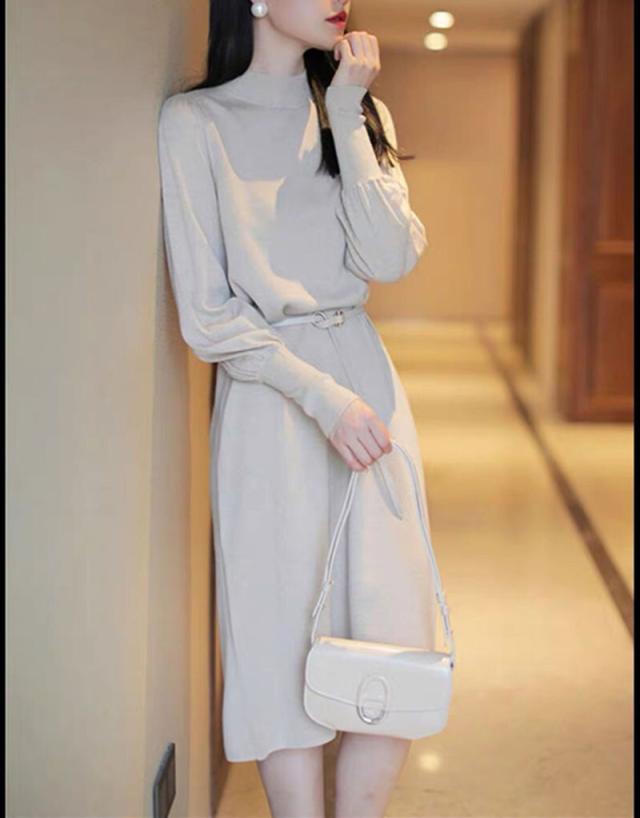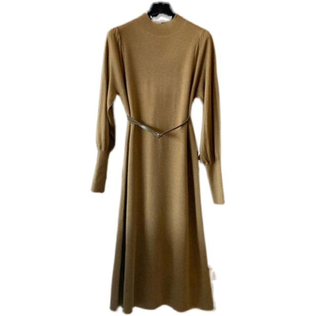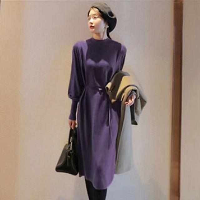 ニットワンピース パフスリーブ ロングカフスニット 春 秋 冬 韓国 シンプル エレガント トレンド 女っぽ レディース タートルネック 暖かい ひざ丈 ベルト 20代 30代 40代 お洒落 オシャレ 可愛い かわいい スタイルアップ 細見え パープル 紫 上品 きれいめ
