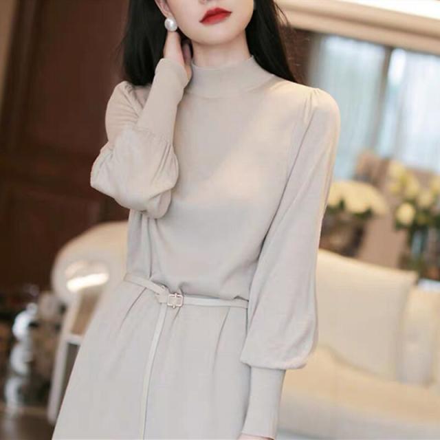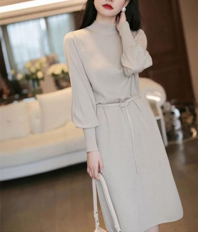 ニットワンピース パフスリーブ ロングカフスニット 春 秋 冬 韓国 シンプル エレガント トレンド 女っぽ レディース タートルネック 暖かい ひざ丈 ベルト 20代 30代 40代 お洒落 オシャレ 可愛い かわいい スタイルアップ 細見え パープル
