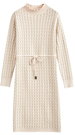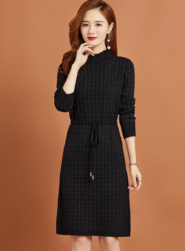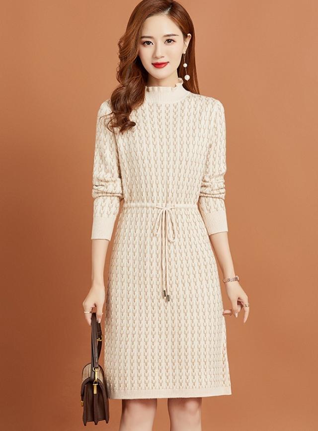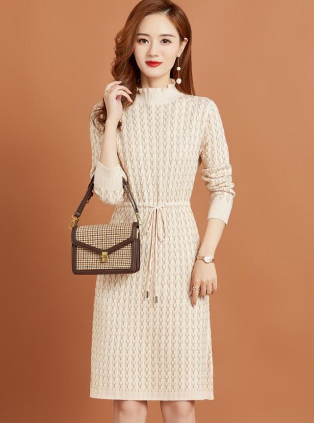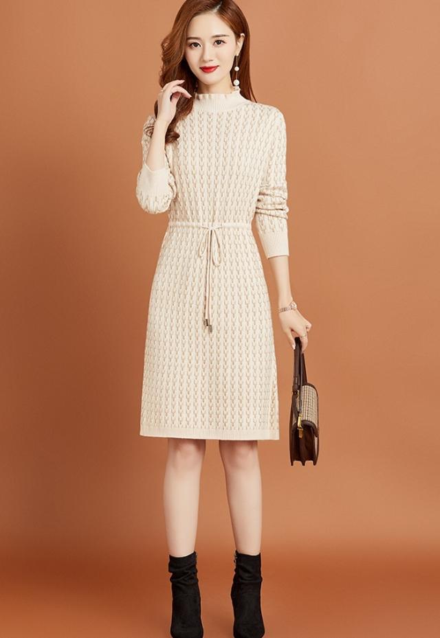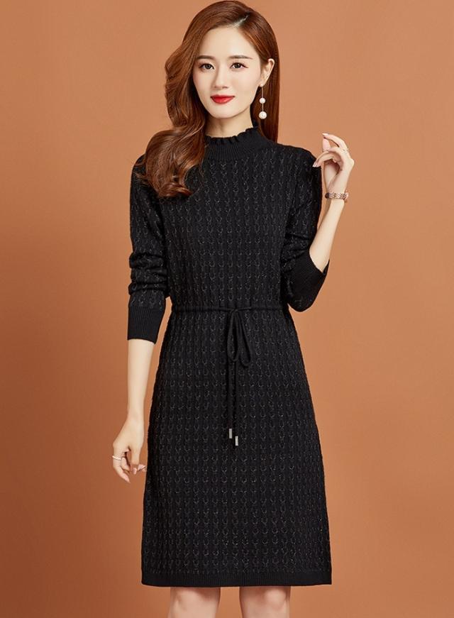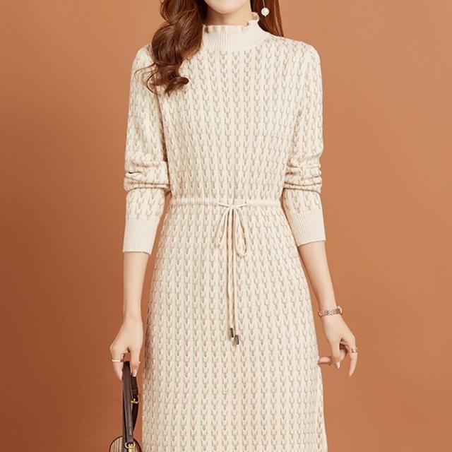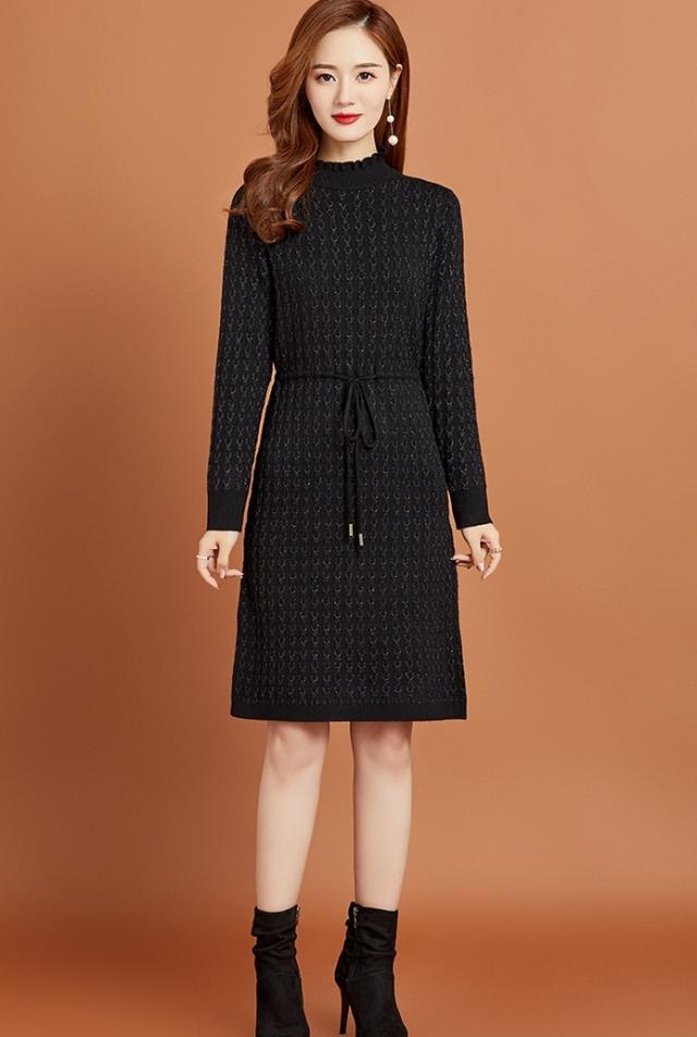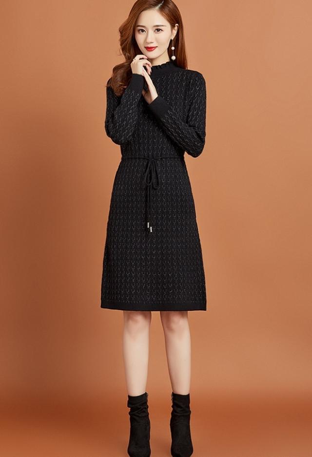 ニットワンピース リボン ボトルネック レディース ひざ丈 膝上 長袖 ハイネック 暖かい 無地 シンプル 大人可愛い 大人女子 女子会 上品 デート かわいい 可愛い エレガント ふりふり 20代 30代 40代 ウエストマーク くびれ タイト スリム 細身 細見え