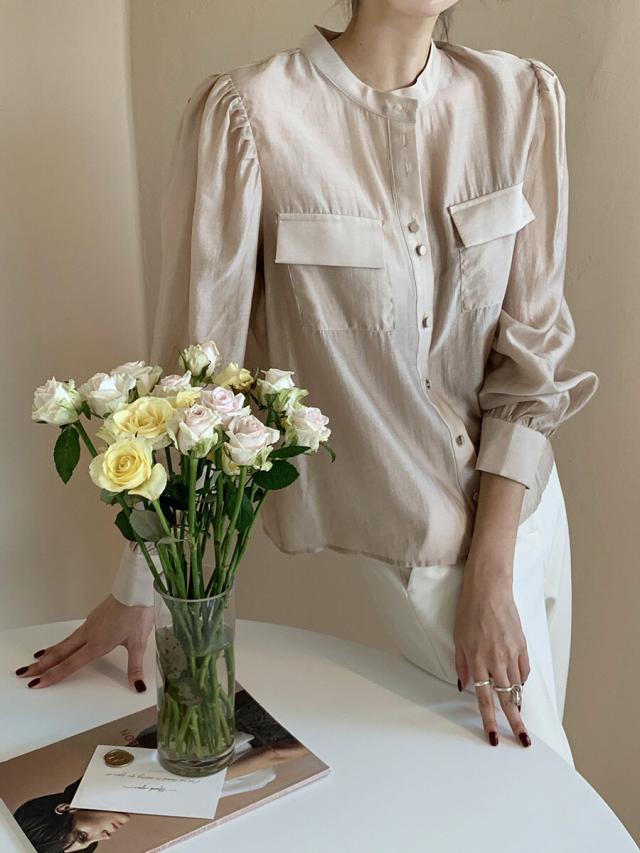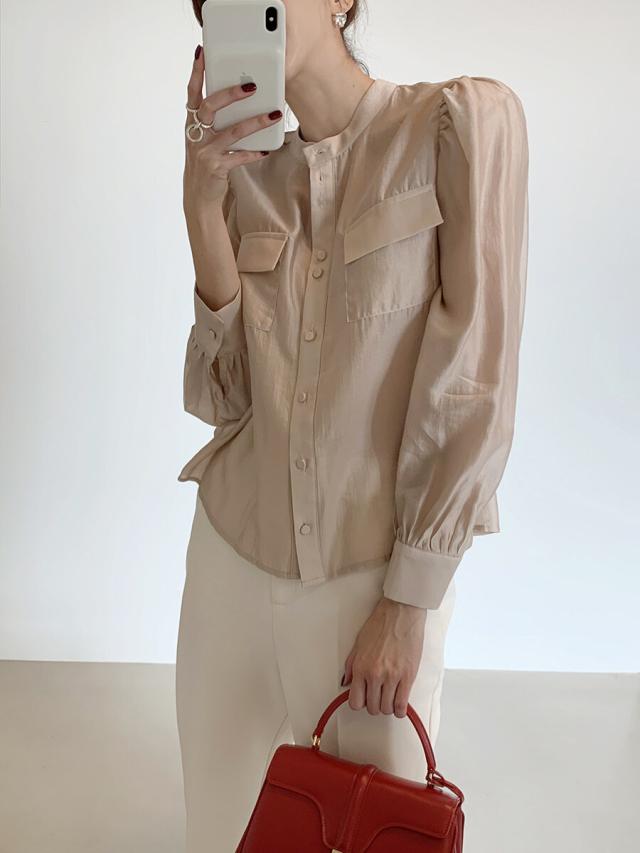 ブラウス レディース トップス シャツ ワンサイズ フリーサイズ ブラック 黒 ベージュ 無地 サテン 光沢感 春 秋 長袖 胸ポケット ノーカラー バンドカラー フェミニン ナチュラル カジュアル きれいめ きれカジ 大人 大人可愛い こなれ感 ぬけ感 存在感 主役級 休日 お出かけ