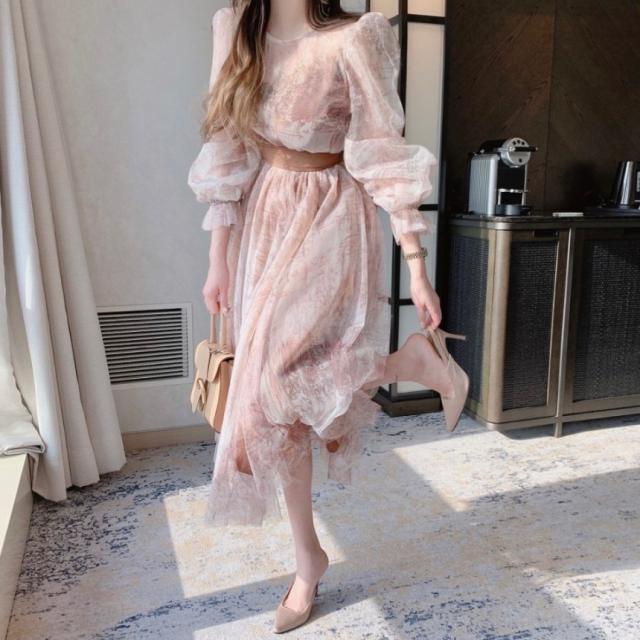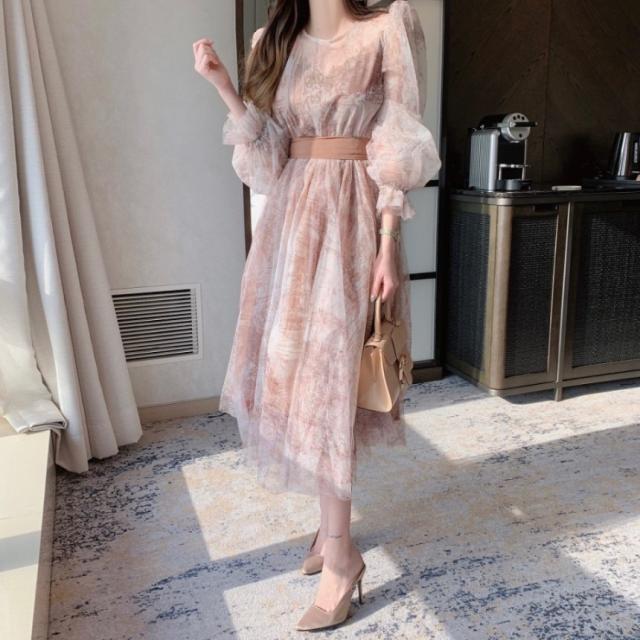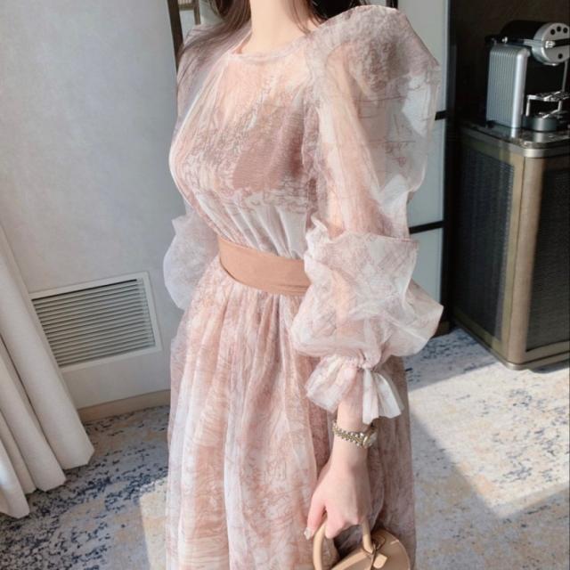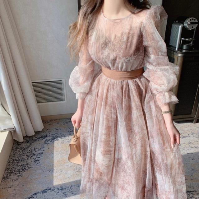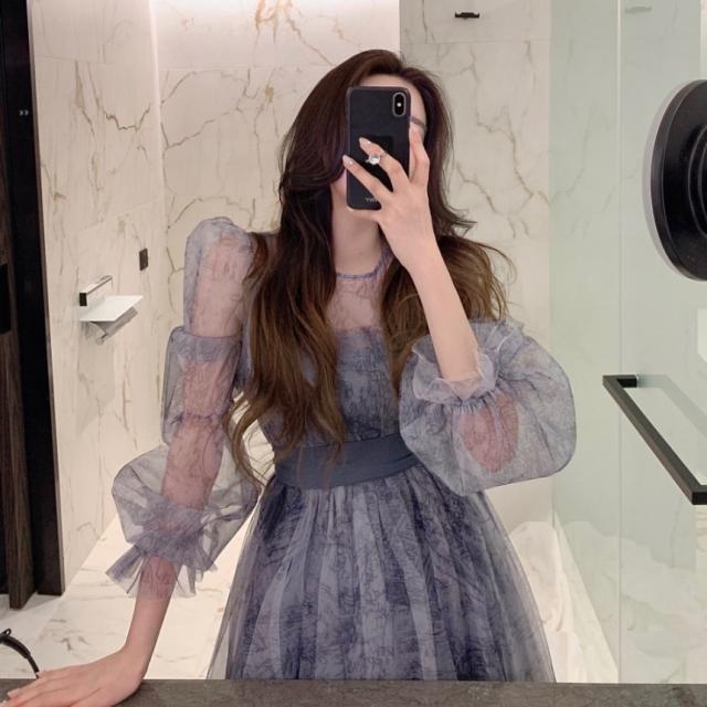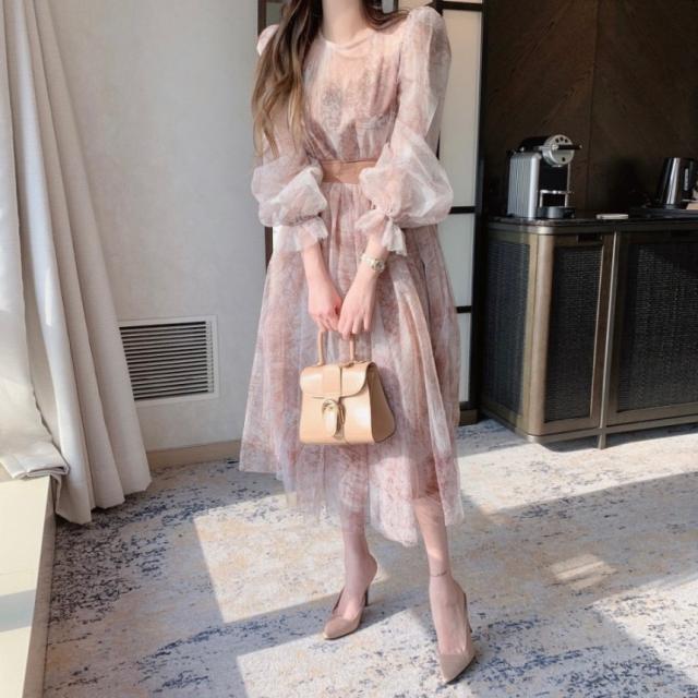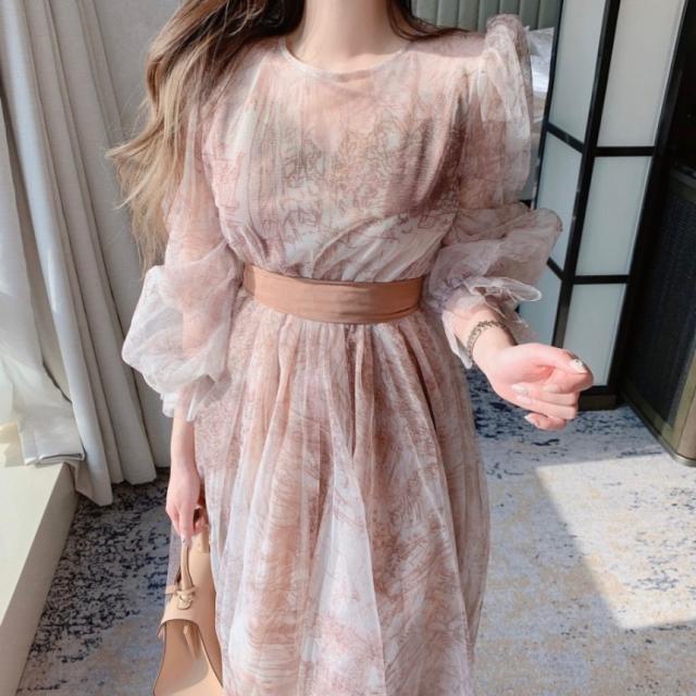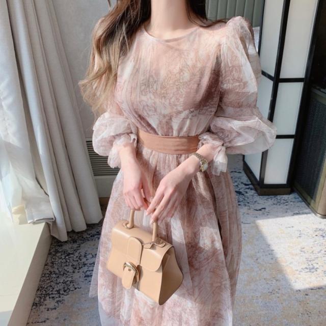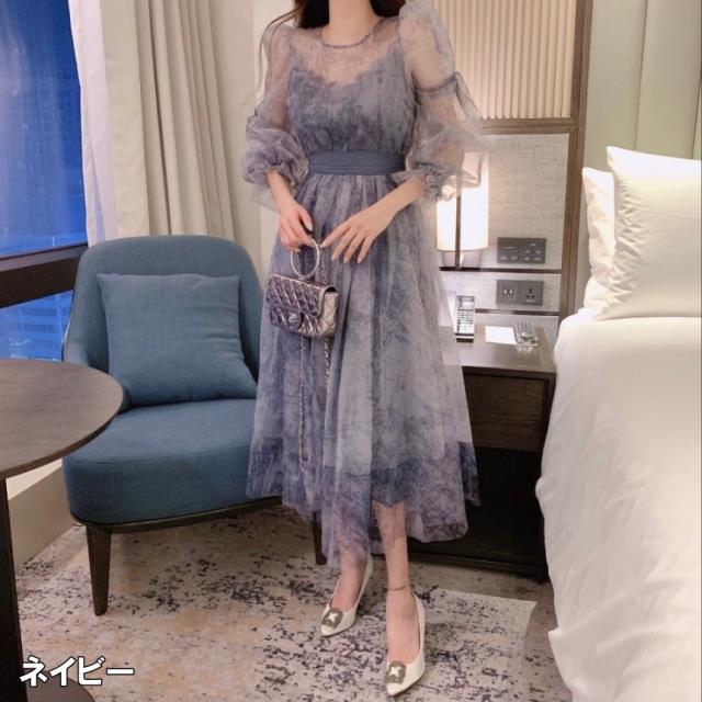 ドレス レディース パーティードレス ミディドレス ワンピース ワンサイズ フリーサイズ ネイビー 紺 ブラウン 茶色 シフォン シースルー 透け感 クルーネック 半袖 パフスリーブ ボリューム袖 ランタンスリーブ シアースリーブ フレア Aライン ふんわり ミドル丈 ミドル ミディ丈 ミディ 膝丈 ミモレ丈 ハイウエスト ウエストリボン 美脚 脚長 フェミニン モテ ガーリー キュート 大人 大人可愛い 上品 エレガント シック クール 存在感 主役級 パーティー 2次会 1.5次会 韓国 オルチャン