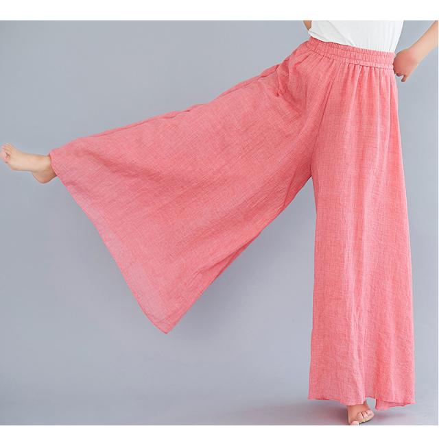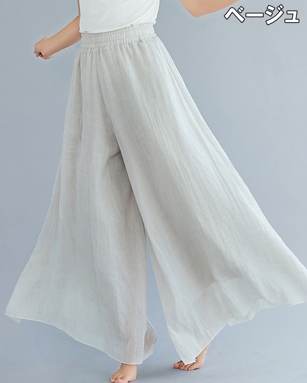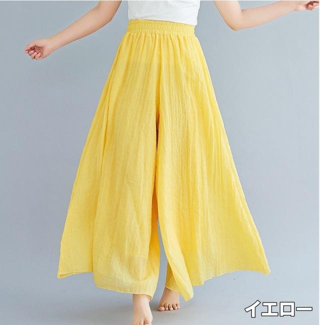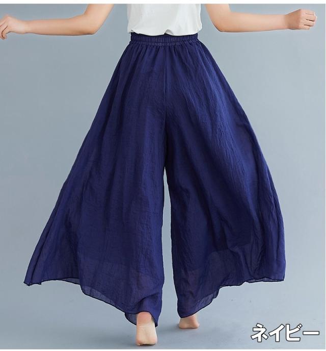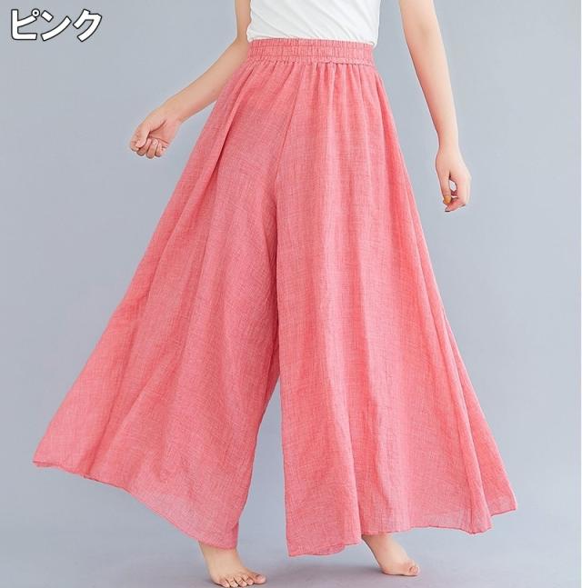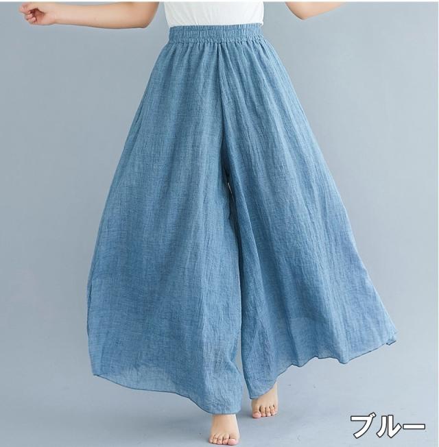 パンツ レディース フレアパンツ ガウチョパンツ ワイドパンツ コットンリネンパンツ 85cm 95cm ウエストゴム ブルー 青 パープル 紫 ピンク イエロー 黄色 ネイビー 紺 ベージュ 大人カラー パステルカラー フレア ワイド ふんわり ルーズ ゆったり ロング丈 ロング