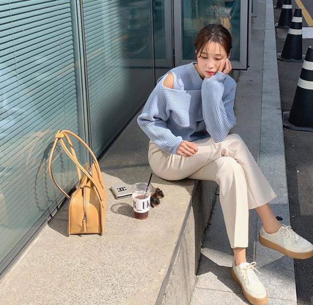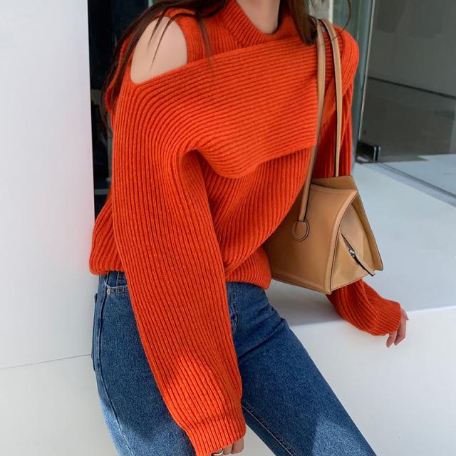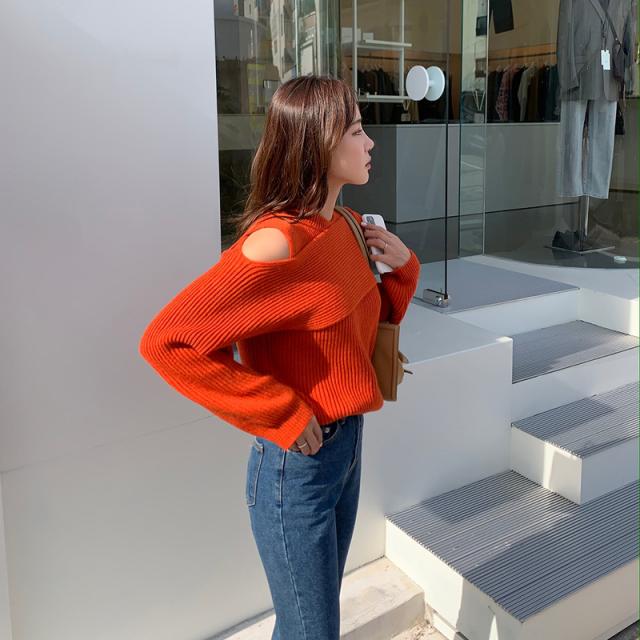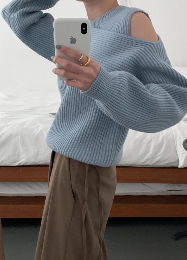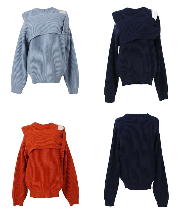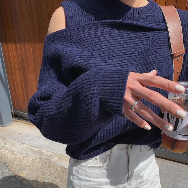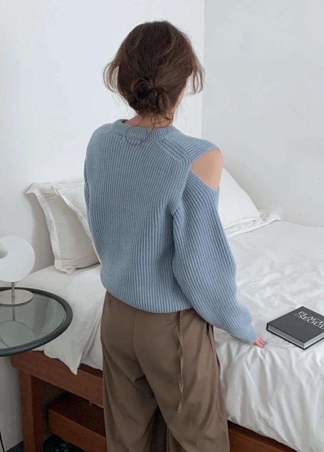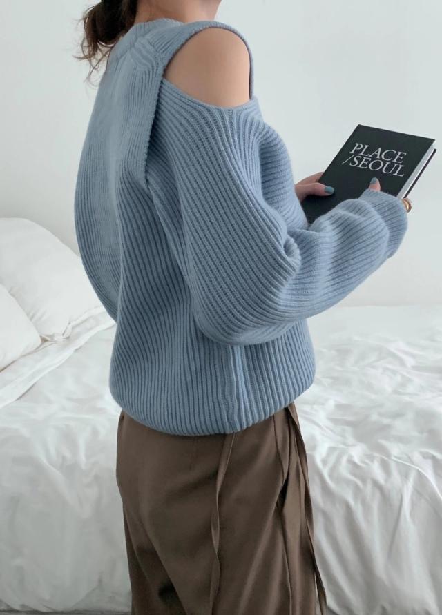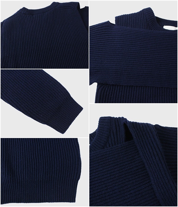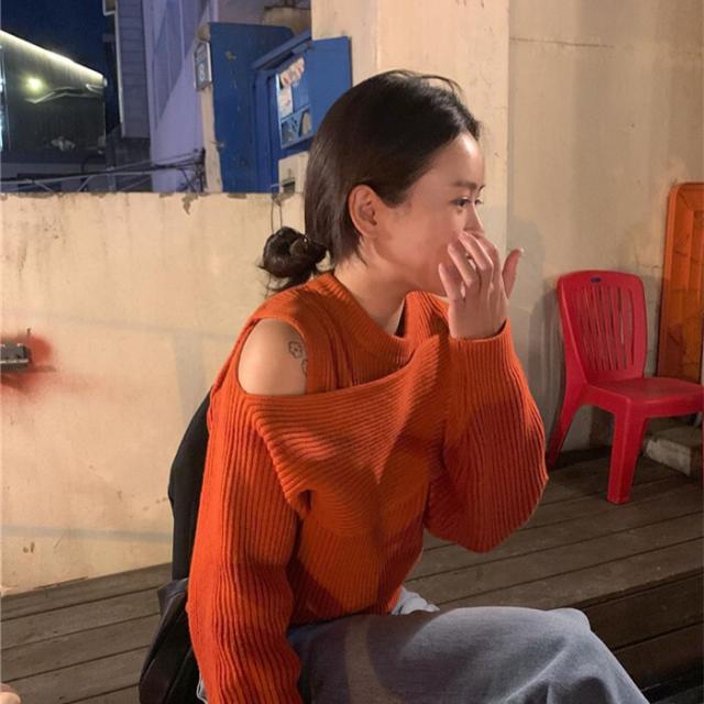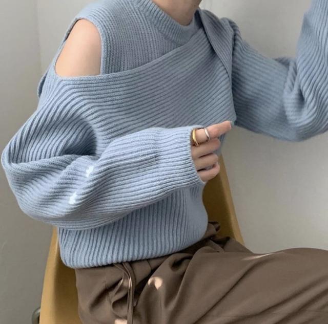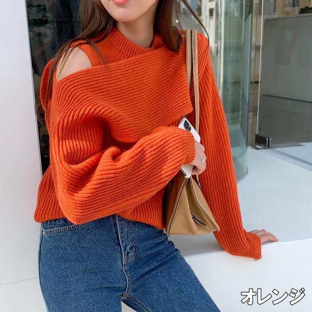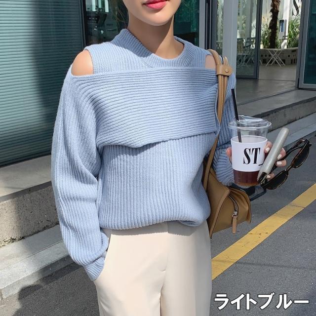 ニット レディース トップス セーター ワンサイズ フリーサイズ ライトブルー 青 ネイビー 紺 オレンジ 大人カラー くすみカラー 秋カラー 秋 冬 クルーネック オープンショルダー オフショルダー 変形 リブ 長袖 ボリューム袖 ショート丈 ショート コンパクト ヘルシー 肌見せ フェミニン ナチュラル カジュアル きれいめ きれカジ 大人 大人可愛い こなれ感 ぬけ感 デート 休日 お出かけ 万能 着回し シンプル ガーリー モテ キュート 存在感 主役級 学生 通学 韓国 オルチャン