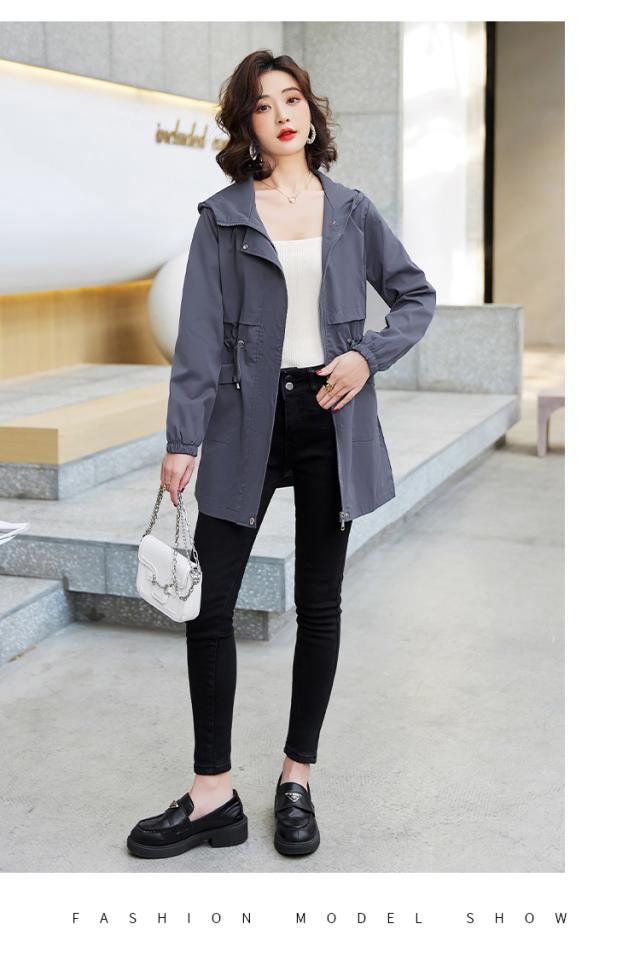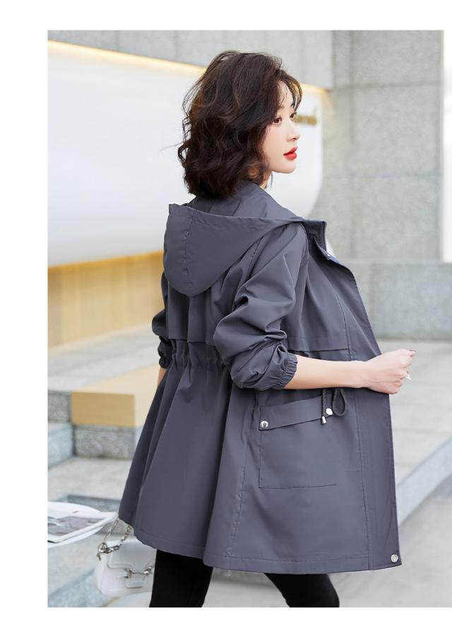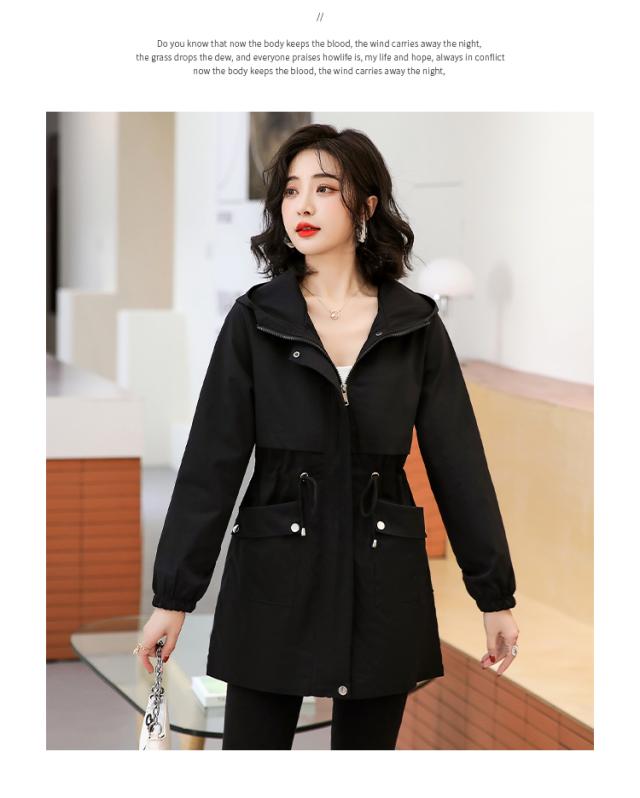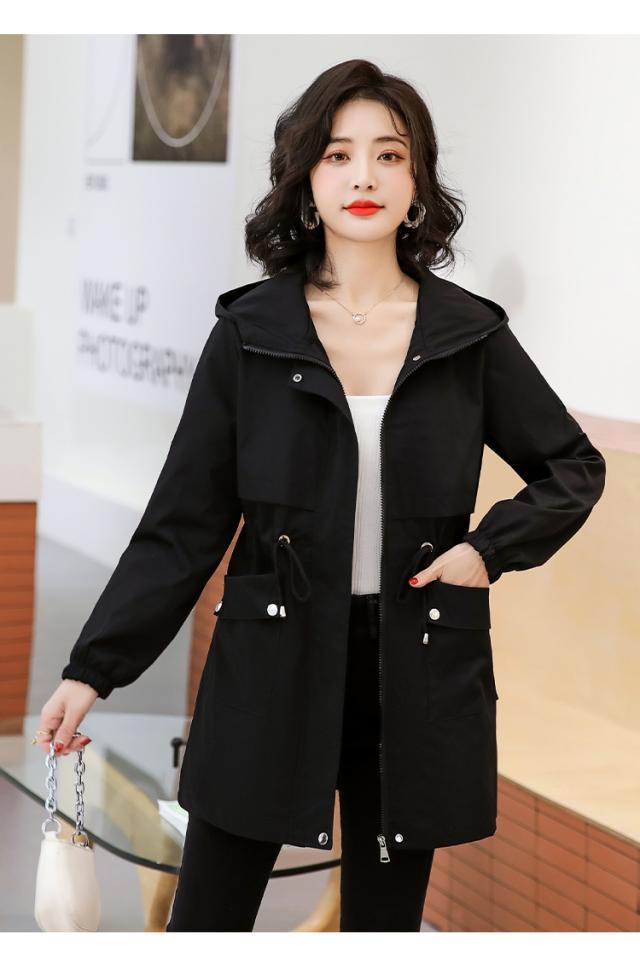 秋のフード付きワークジャケット トップス コート ジャケット 上着 トレンチコート ミドル丈 袖あり 長袖 襟付き スマート ファスナー 前開き ポリエステル 大人可愛い 大人 上品 お洒落 かっこいい モダン 無地 春 秋 20代 30代 通勤 韓国系 M L XL 2XL 3XL ゆる ブラック