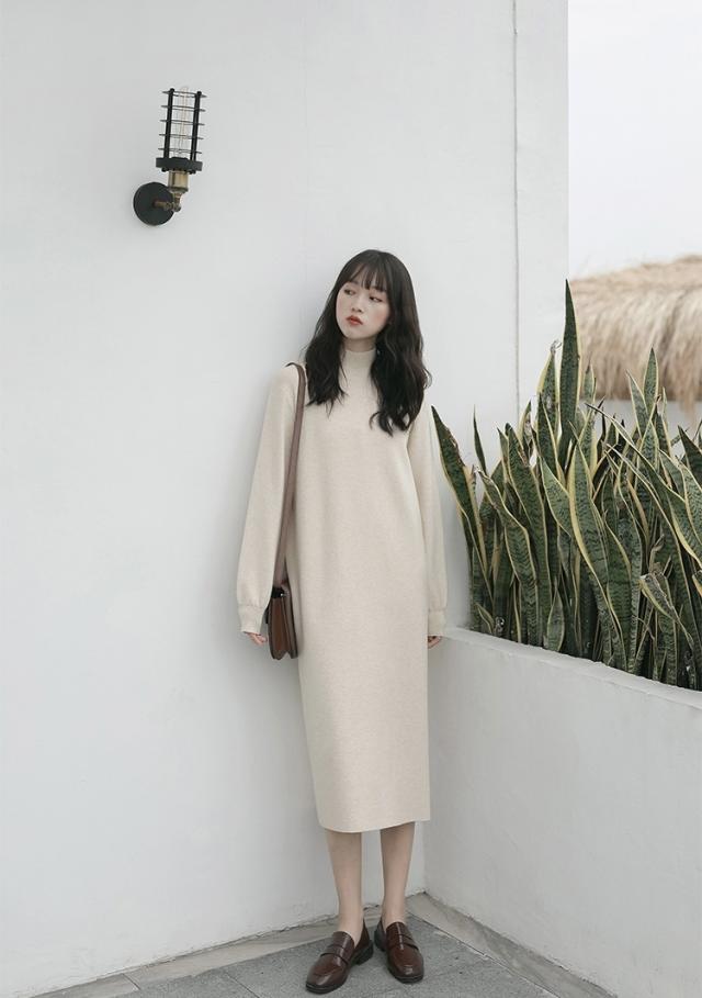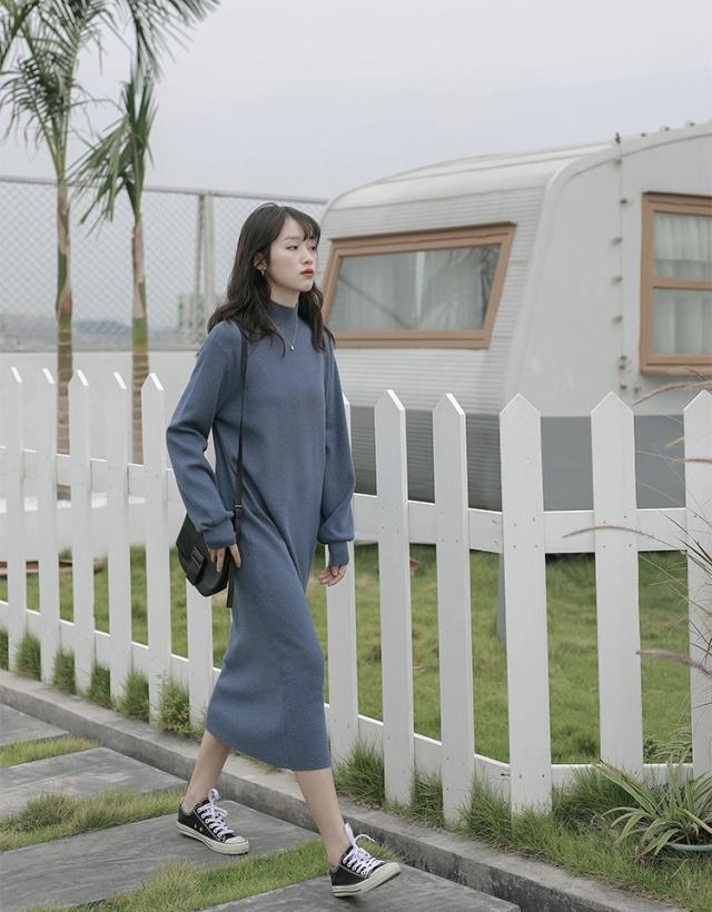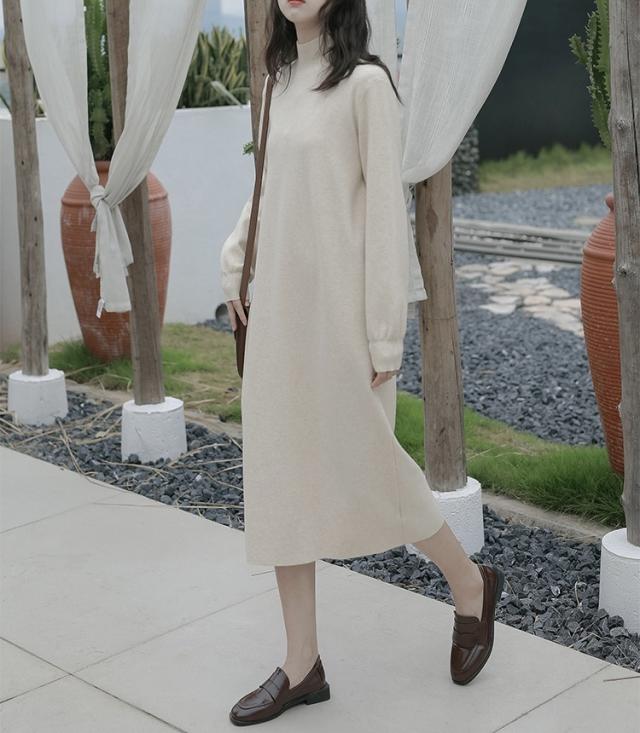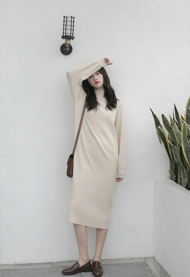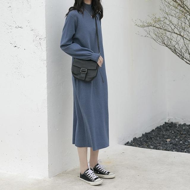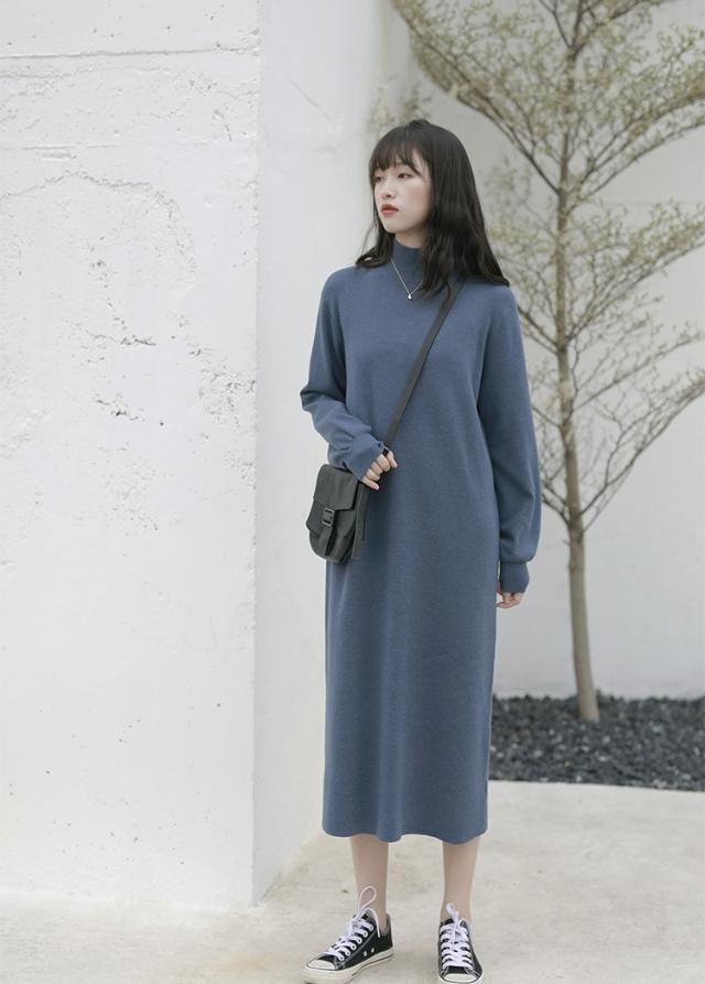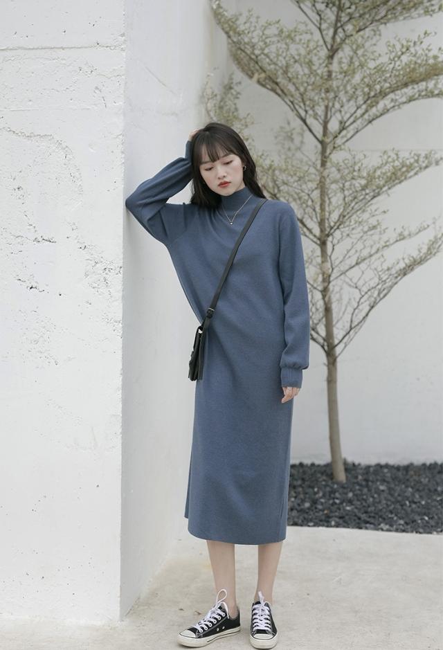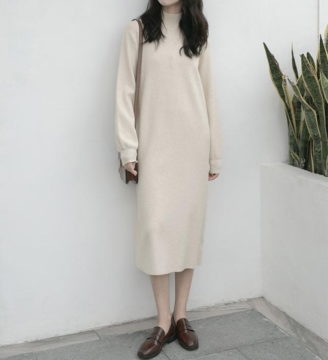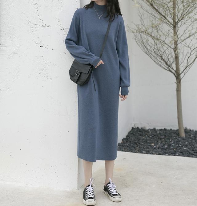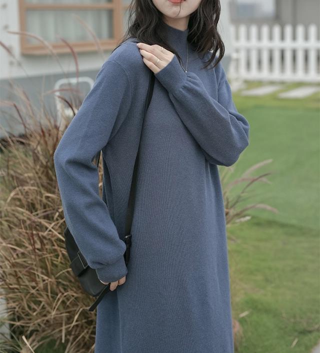 ニットワンピース ハイネック 萌え袖 秋 冬 レディース くすみカラー ゆったり ラフ 抜け感 とろみ フリーサイズ 大きめ 大きいサイズ 膝下 ひざ丈 ロングワンピース 20代 30代 40代 50代 暖かい 無地 シンプル ママ 妊婦 くすみカラー シンプル カジュアル 大人可愛い 大人女子
