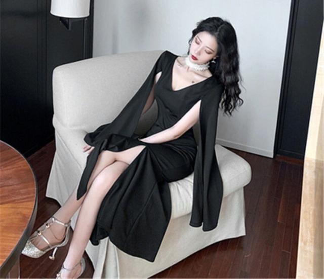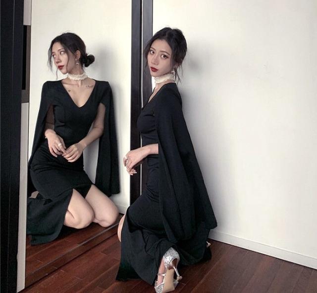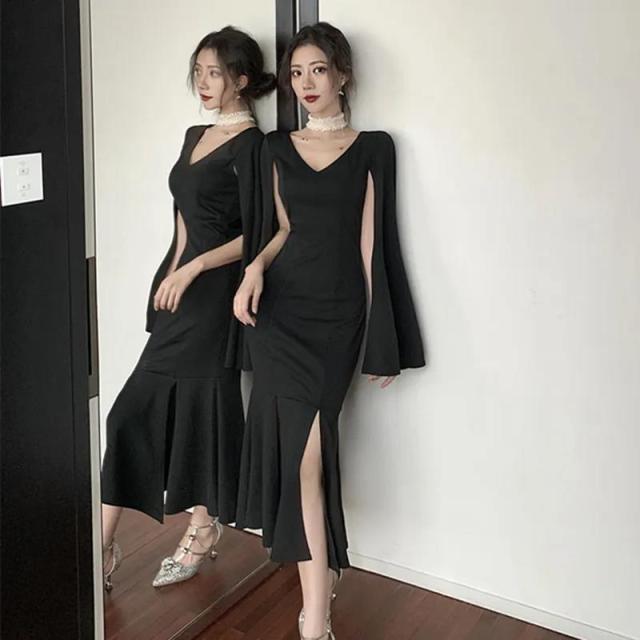 パーティードレス レディース ドレス ワンピース 2XL ブラック 黒 大人カラー モノトーン 無地 スリット サイドスリット Vネック デコルテ 半袖 ノースリーブ スプリットスリーブ フレアスリーブ タイト フィット スリム 細身 くびれ ロング丈 ロング ミモレ丈 アンクル丈 膝下 ハイウエスト 美脚 脚長 美シルエット 美ライン セクシー キャバ スタイルアップ 体型カバー フェミニン モテ 大人 大人可愛い 上品 エレガント 存在感 主役級 パーティー 2次会 1.5次会 謝恩会 お呼ばれ