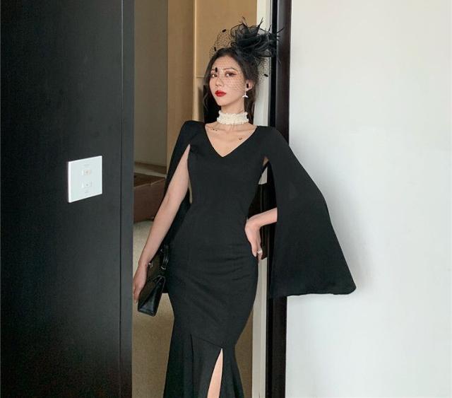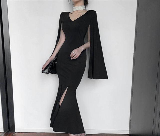 パーティードレス レディース ドレス ワンピース 2XL ブラック 黒 大人カラー モノトーン 無地 スリット サイドスリット Vネック デコルテ 半袖 ノースリーブ スプリットスリーブ フレアスリーブ タイト フィット スリム 細身 くびれ ロング丈 ロング ミモレ丈 アンクル丈