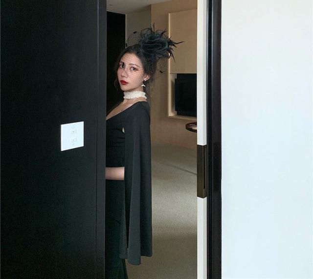 ロングのスプリットスリーブが目をひくドレス。