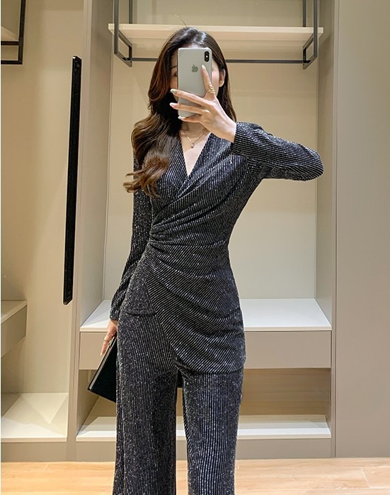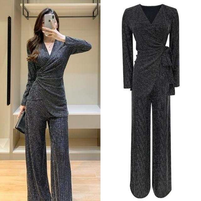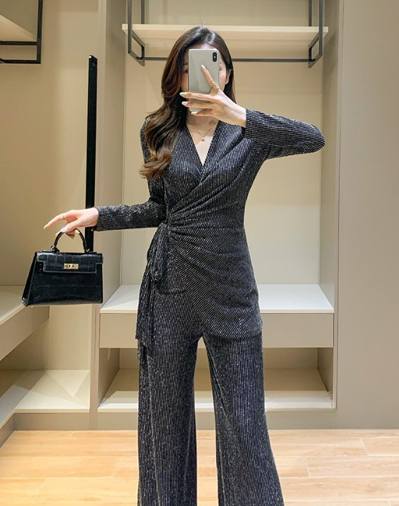 セットアップ レディース セット 2点セット ツーピース パンツスーツ 上下セット M L XL シルバー ストライプ 柄 大人カラー くすみカラー トップス カットソー Vネック 長袖 ウエストリボン ウエストベルト ボトムス パンツ ワイドパンツ ワイドレッグ フレア フェミニン 大人 きれいめ きれカジ カジュアル クール スタイリッシュ シック 上品 モード かっこいい 万能 着回し こなれ感 ぬけ感 存在感 主役級 韓国 オルチャン パーティー 二次会 謝恩会 お呼ばれ 華やか 衣装 女子会