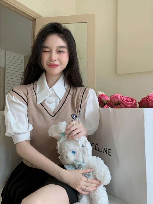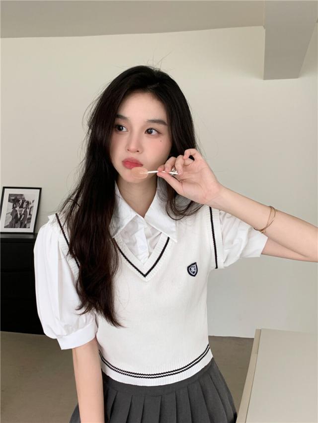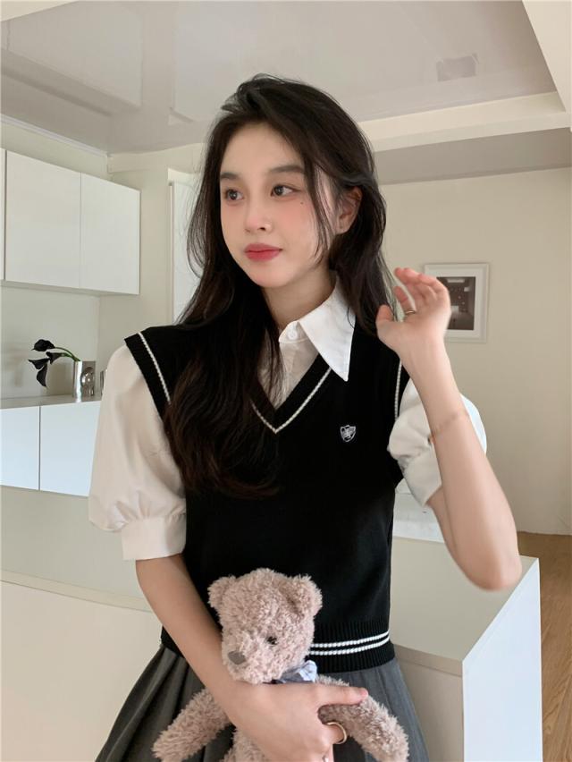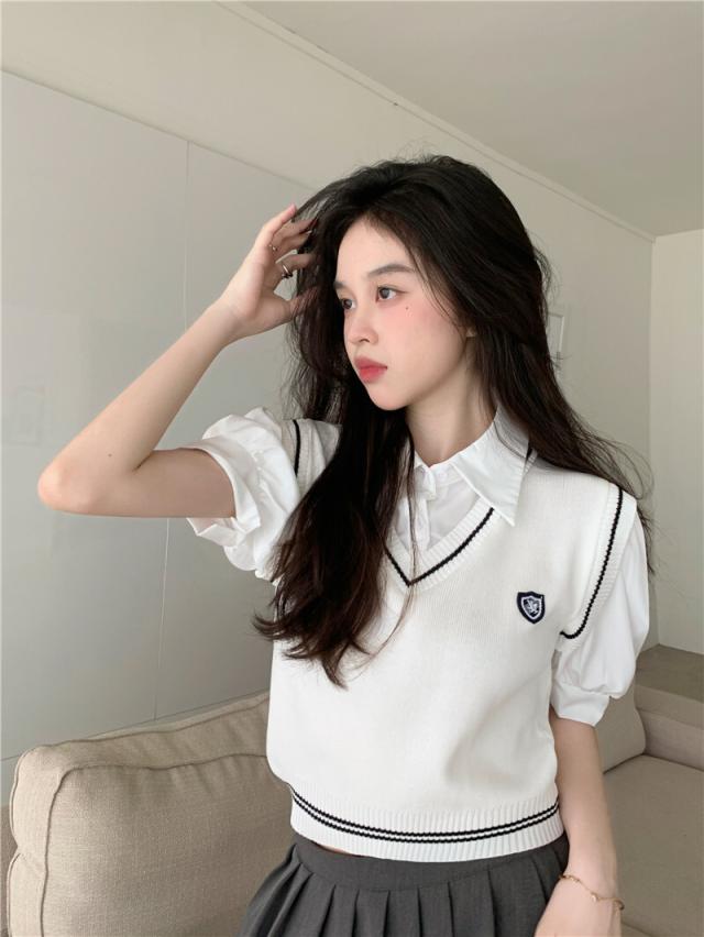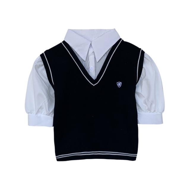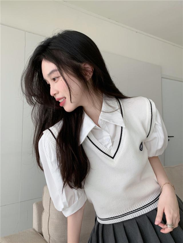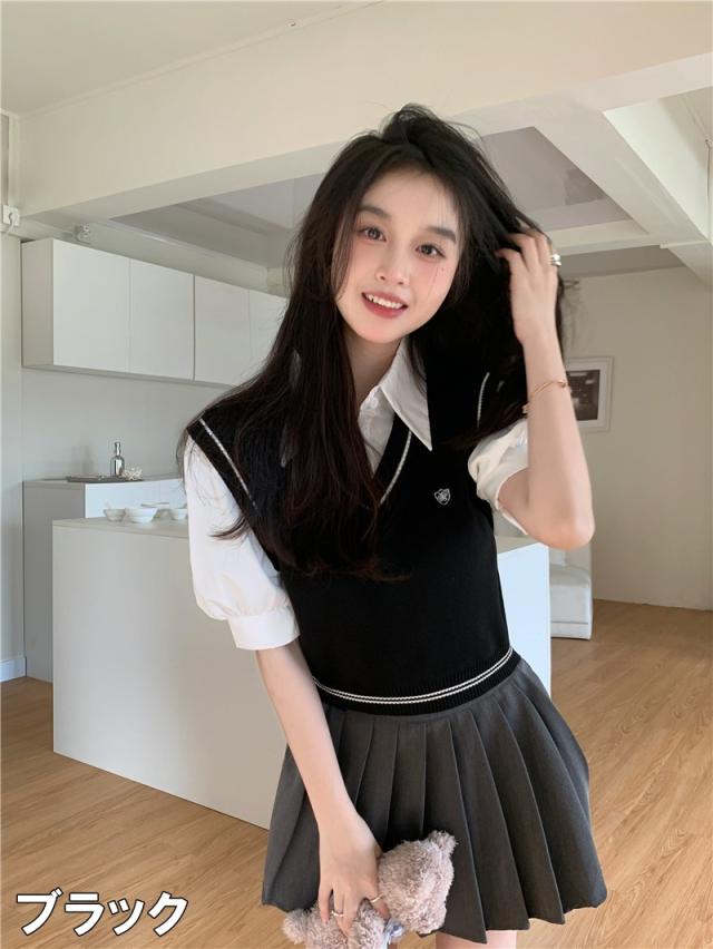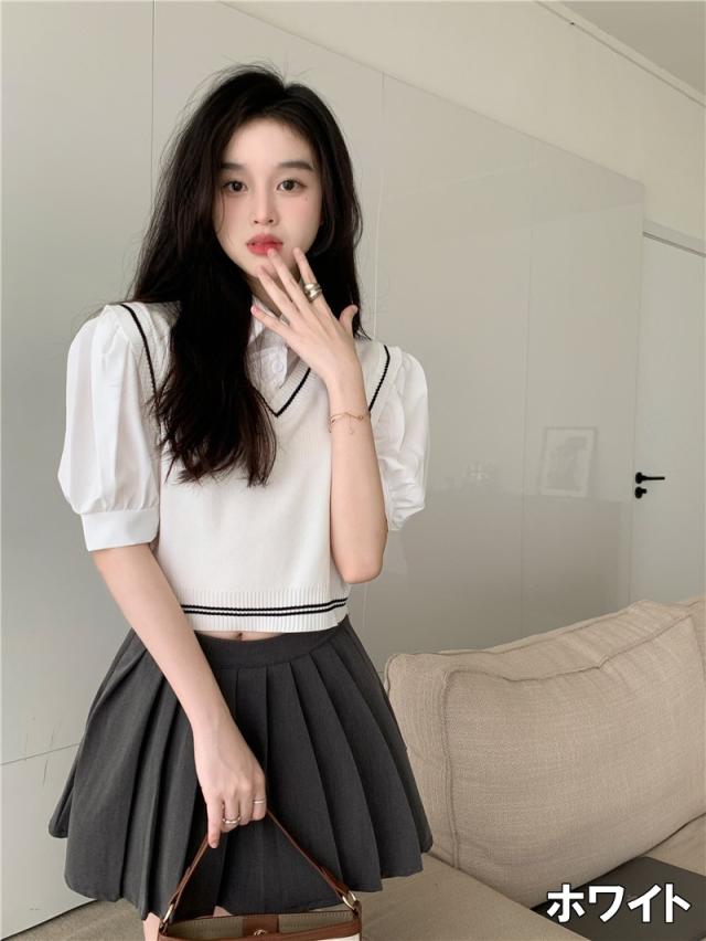 トップス レディース フェイクツーピース ベスト シャツ ブラウス 重ね着風トップス レイヤードトップス ワンサイズ フリーサイズ ベージュ ブラック 黒 ホワイト 白 大人カラー Vネック ニット ワンポイント ライン 無地 春 夏 半袖 パフスリーブ ふんわり袖 コンパクト スリム 細身 ショート丈 ショート カレッジ風 カレッジ フェミニン ナチュラル カジュアル さわやか シンプル ベーシック 定番 着回し 大人 大人可愛い 存在感 主役級 休日 学生 通学 韓国 オルチャン コスプレ 衣装 撮影