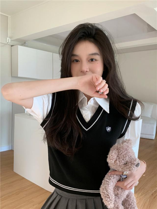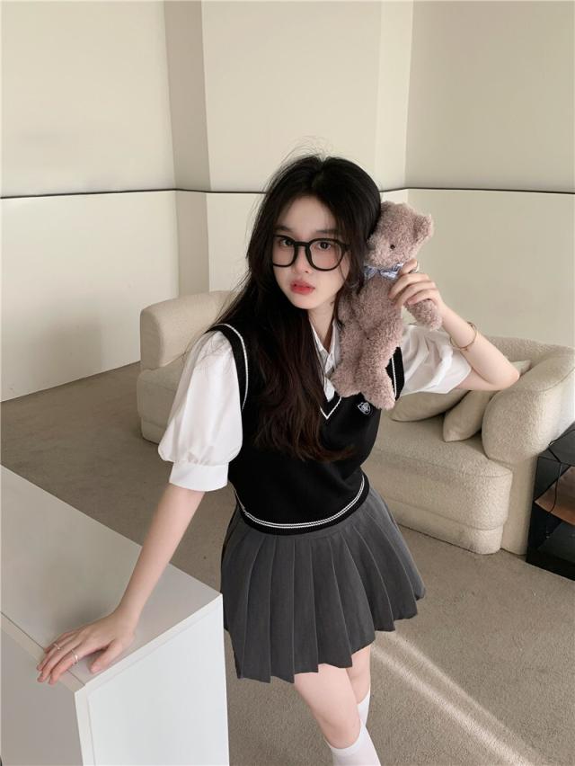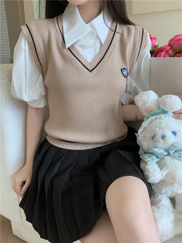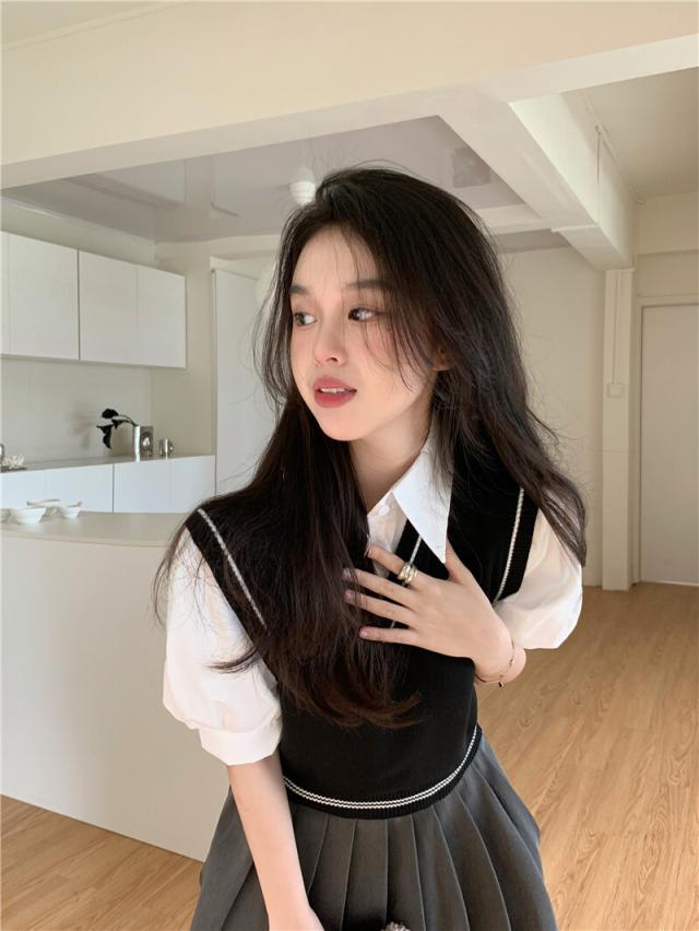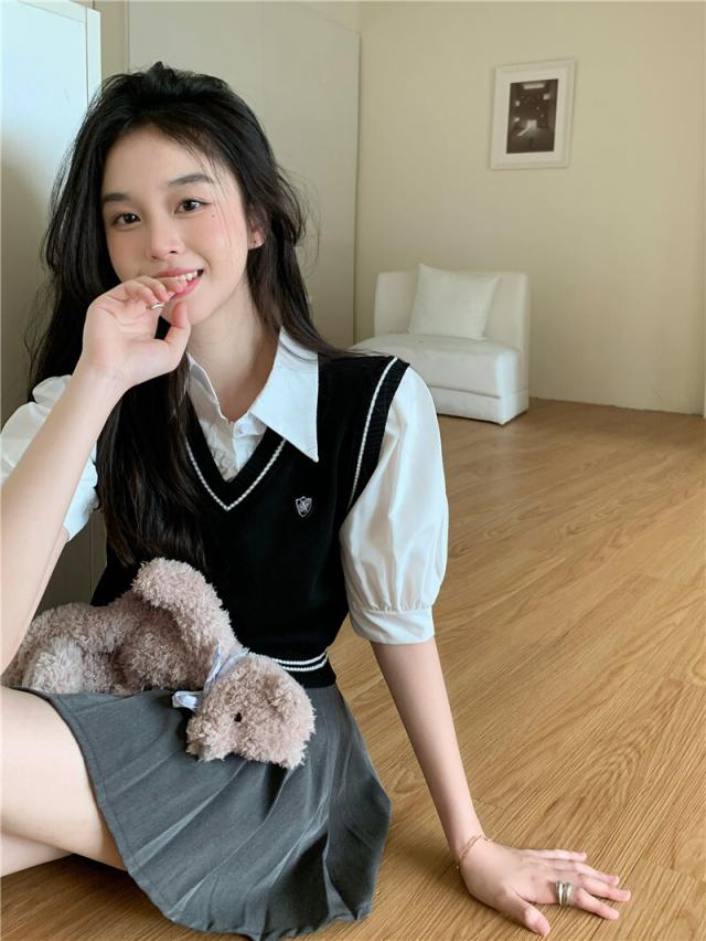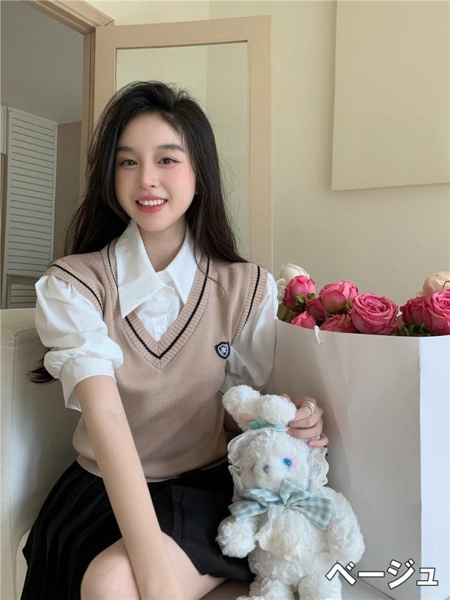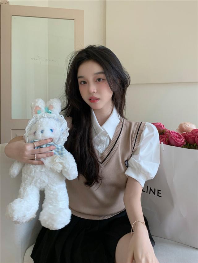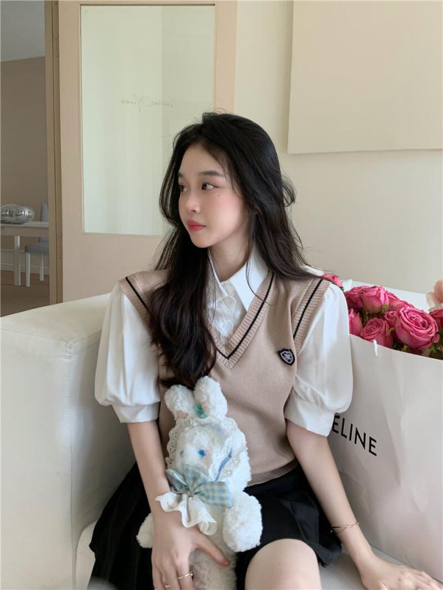 トップス レディース フェイクツーピース ベスト シャツ ブラウス 重ね着風トップス レイヤードトップス ワンサイズ フリーサイズ ベージュ ブラック 黒 ホワイト 白 大人カラー Vネック ニット ワンポイント ライン 無地 春 夏 半袖 パフスリーブ ふんわり袖 コンパクト スリム 細身 ショート丈 ショート カレッジ風 カレッジ フェミニン ナチュラル カジュアル さわやか シンプル ベーシック 定番 着回し 大人 大人可愛い 存在感 主役級 休日 学生 通学 韓国 オルチャン コスプレ 衣装 撮影