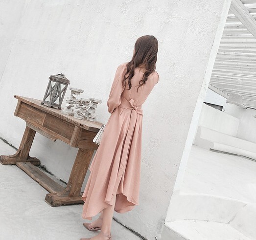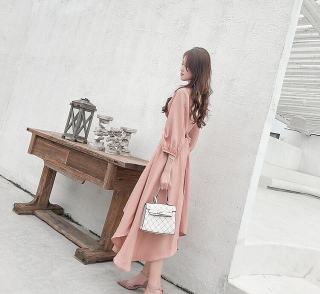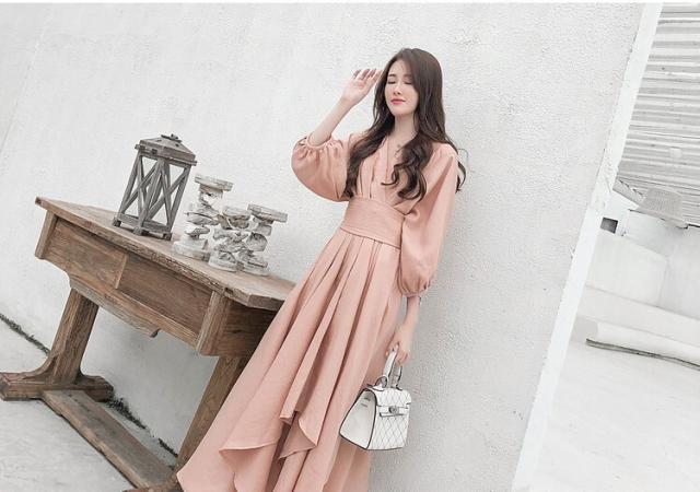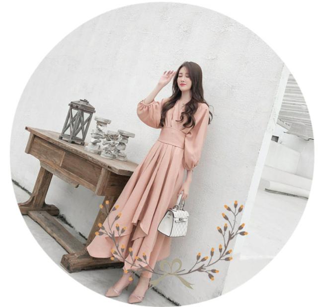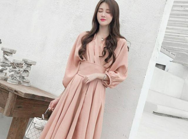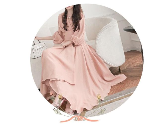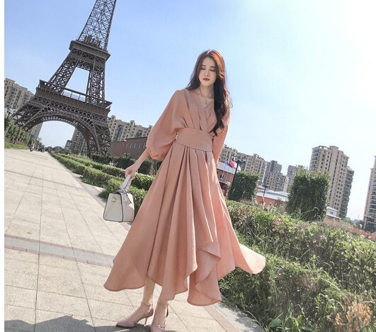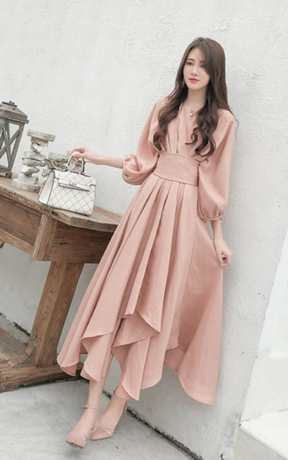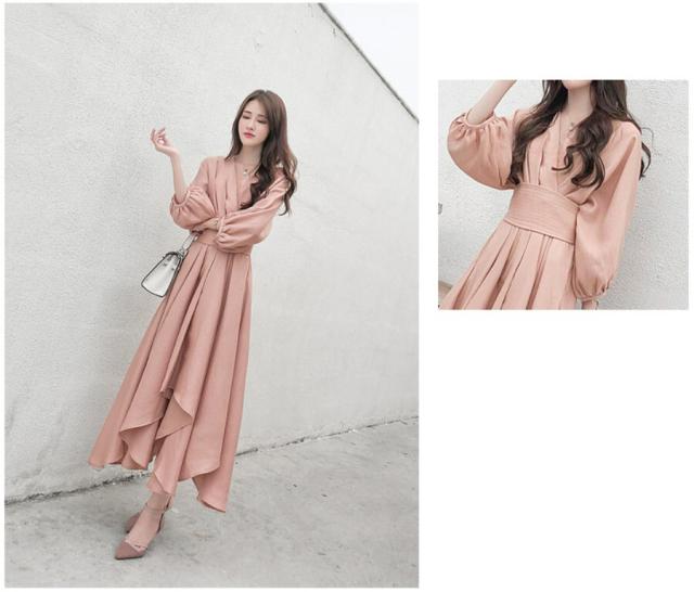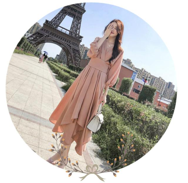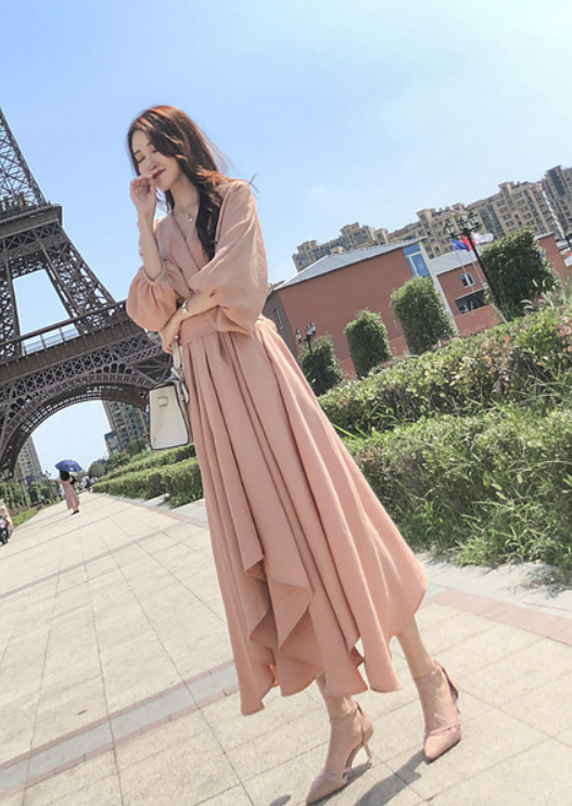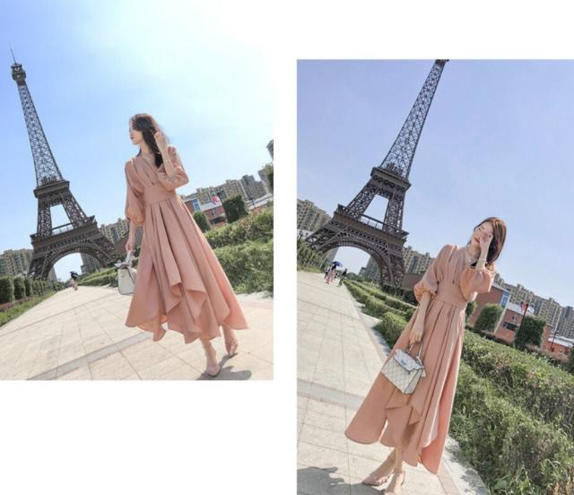 パーティードレス レディース ドレス ワンピース S M L XL ピンク 春カラー パステルカラー 無地 タック アシンメトリー Vネック 七分袖 7分袖 パフスリーブ フレア Aライン ロング丈 ロング ミモレ丈 アンクル丈 膝下 ハイウエスト 脚長 美シルエット スタイルアップ