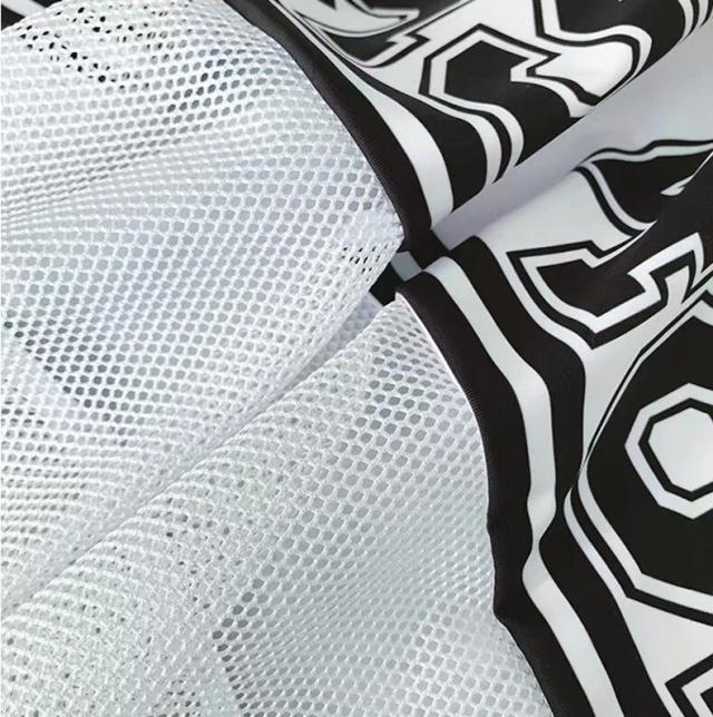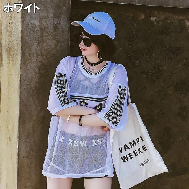 水着3点セット レディース 水着 スイムウェア 3点セット セット セットアップ スリーピース M L XL ホワイト 白 ブラック 黒 モノトーン バイカラー トップス ロゴ プリント メッシュ Tシャツ シースルー 透け感 ライン 半袖 クルーネック ビキニトップ ビキニ タンキニ