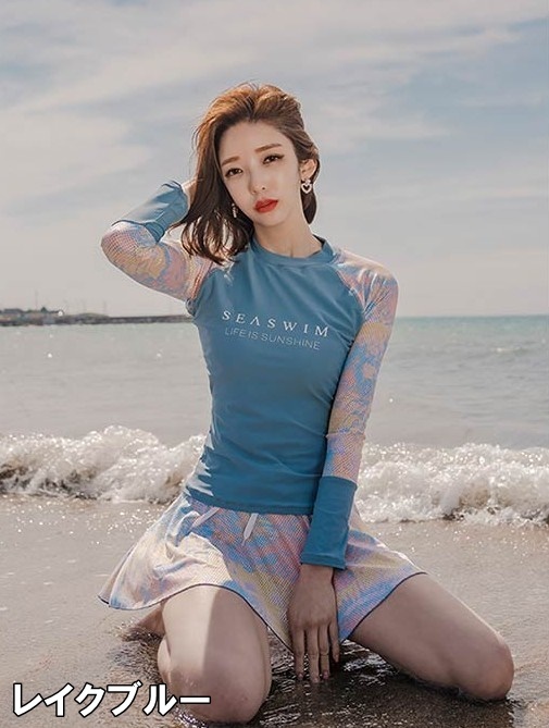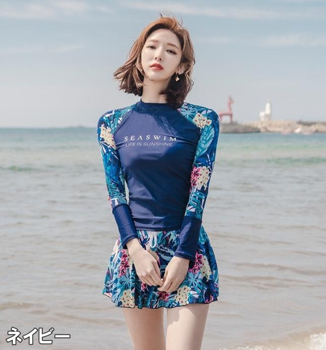 水着2点セット レディース 水着 スイムウェア ビーチウェア セット 2点セット ツーピース セットアップ M L XL 2XL 3XL プラスサイズ 大きいサイズ ネイビー 紺 ブルー 青 ピンク ボタニカル柄 大人カラー パステルカラー 長袖 日焼け防止 クルーネック 脚長 美脚 体型カバー
