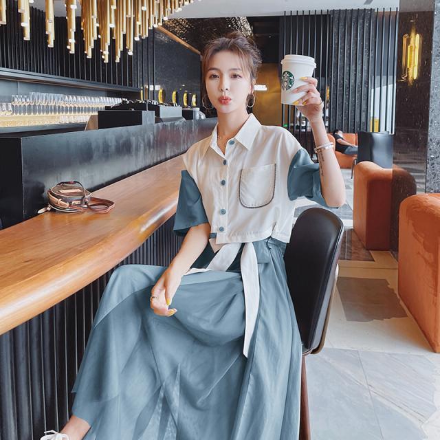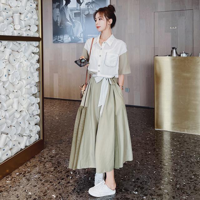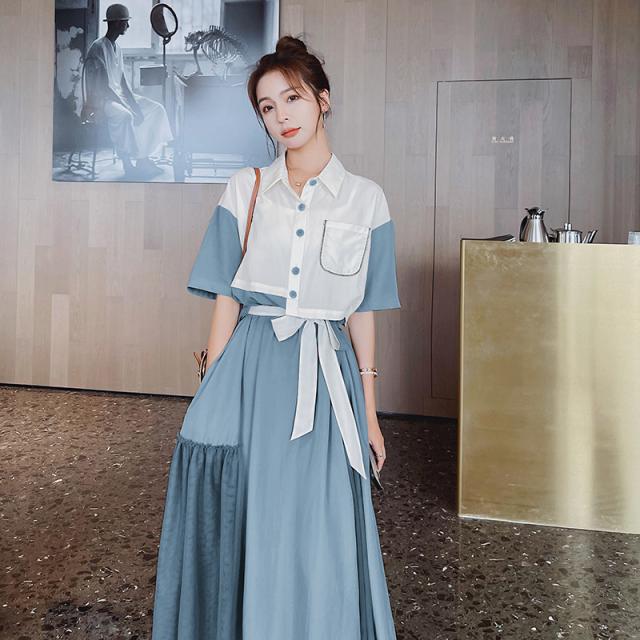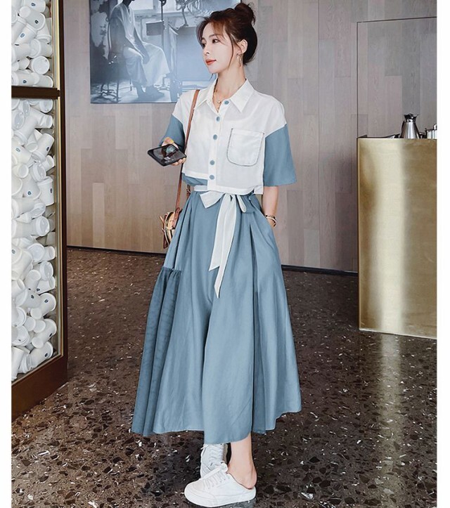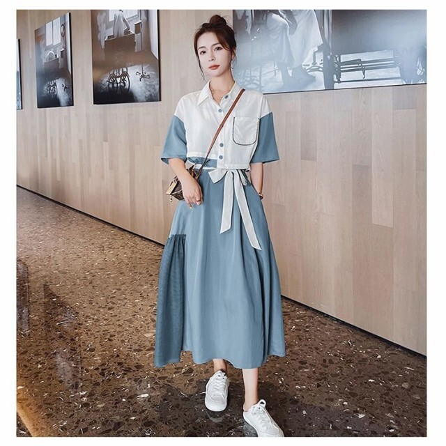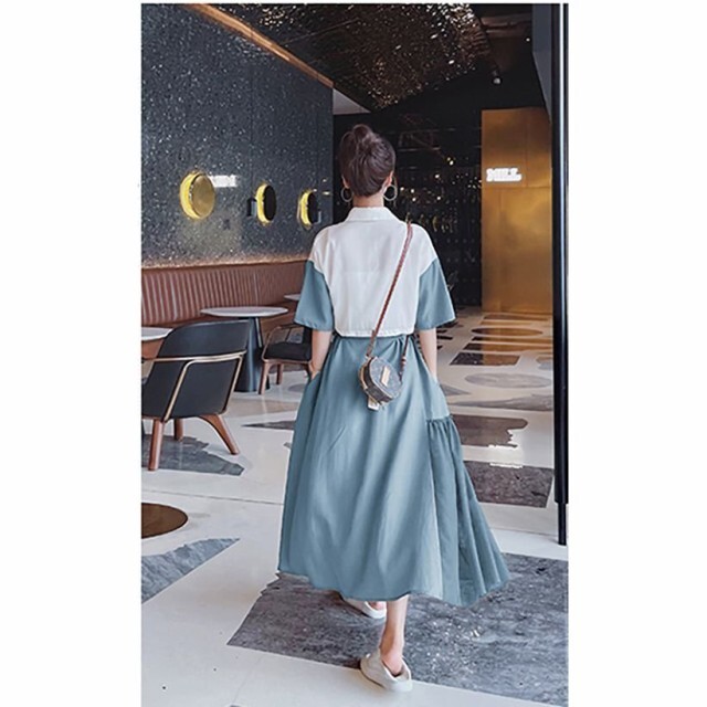 ワンピース レディース フレアワンピース ロング丈 半袖 袖あり 5分袖 五分袖 変形シャツワンピース ドロップショルダー 襟付き 切り替えデザイン ドッキング バイカラー Aライン ウエストリボン ハイウエスト ツーピース風 大人可愛い きれいめ シンプル 上品 おしゃれ お洒落 こなれ感 個性的 パッチワーク とろみ感 存在感 S M L XL 白 ホワイト ブルー 青 緑 グリーン 無地 春 夏 20代 30代 40代 50代 60代 ママ デート お出かけ 女子会 休日 旅行 リゾート