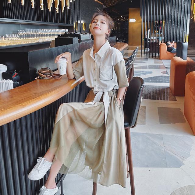 ワンピース レディース フレアワンピース ロング丈 半袖 袖あり 5分袖 五分袖 変形シャツワンピース ドロップショルダー 襟付き 切り替えデザイン ドッキング バイカラー Aライン ウエストリボン ハイウエスト ツーピース風 大人可愛い きれいめ シンプル 上品 おしゃれ