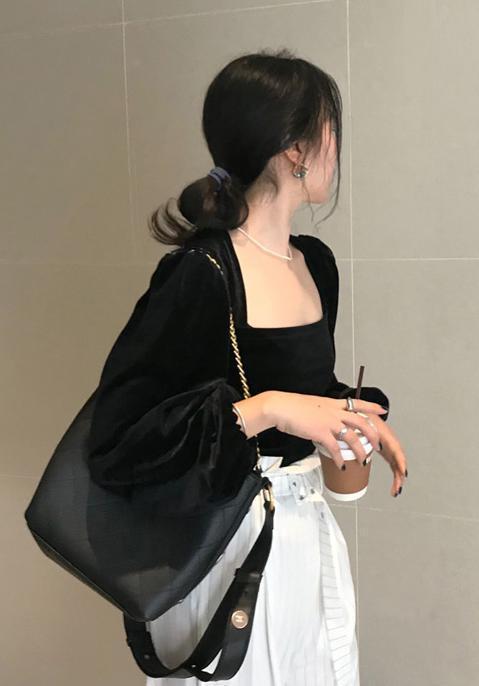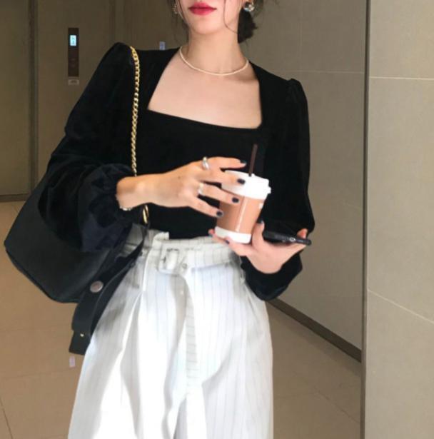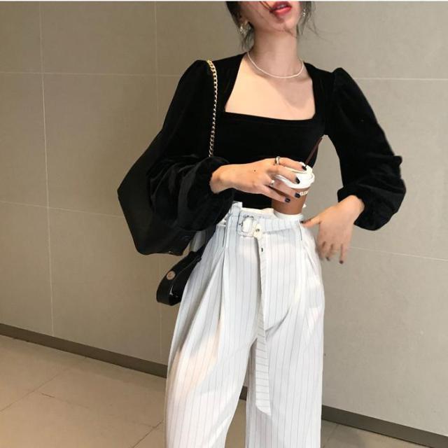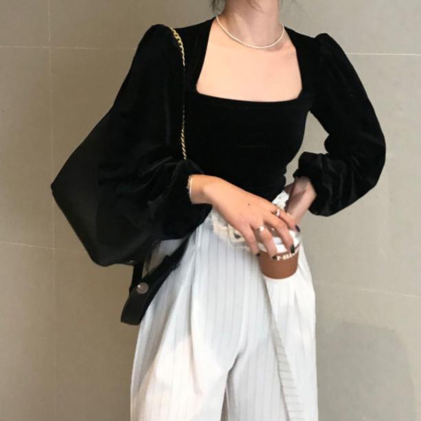 トップス レディース カットソー ブラウス 袖あり 長袖 ボリューム袖 パフスリーブ 萌袖 スクエアネック ベロア ベルベット 大人可愛い きれいめ シンプル 上品 おしゃれ お洒落 かっこいい 大人女子 こなれ感 クール エレガント M L 黒 ブラック 無地 秋 冬 春 10代 20代 30代 40代 50代 学生 通学 デート お出かけ 女子会 普段使い 韓国 韓国系 オルチャン あったか 暖かい 防寒 モテ