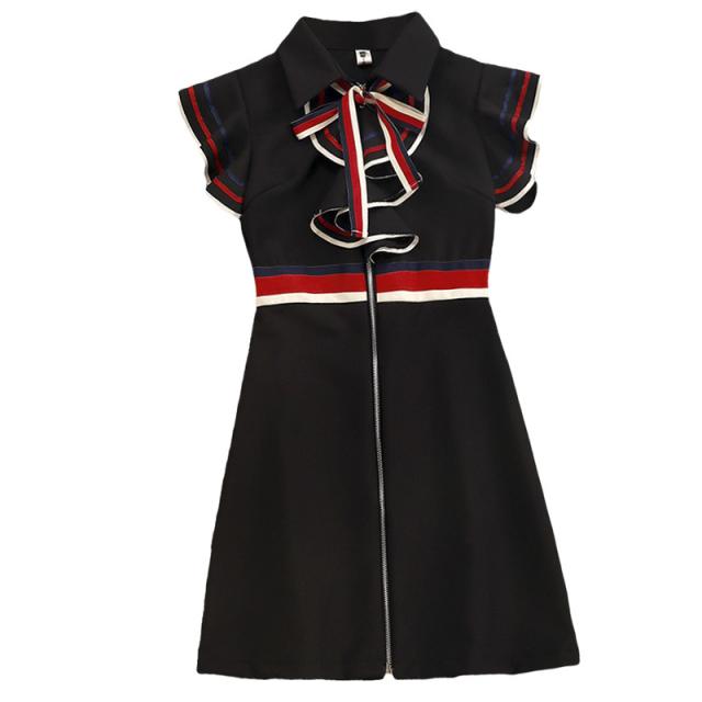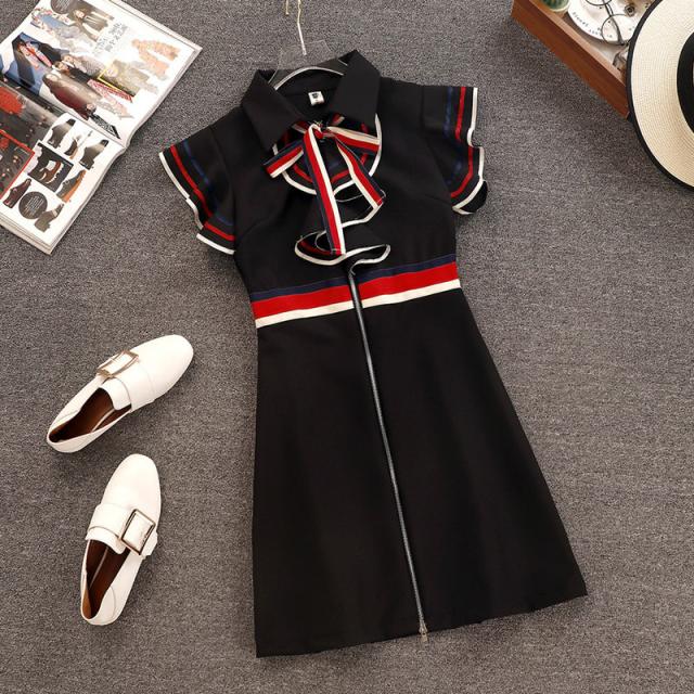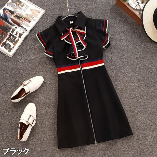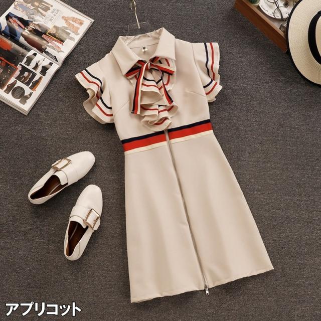 ワンピース レディース ミニワンピ S M L ブラック 黒 アプリコット 大人カラー ニュアンスカラー ライン リボン ジッパー ジップ 春 夏 半袖 フレンチスリーブ フリル袖 襟付き ミニ丈 ミニ ショート丈 ショート 膝上 フレア Aライン ハイウエスト 脚長 美脚 スタイルアップ