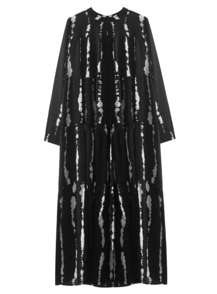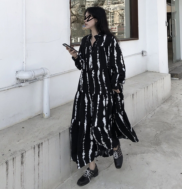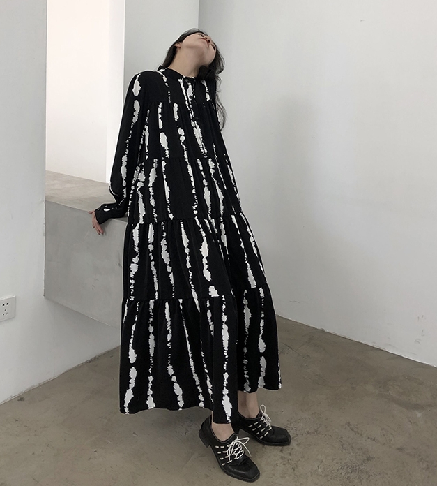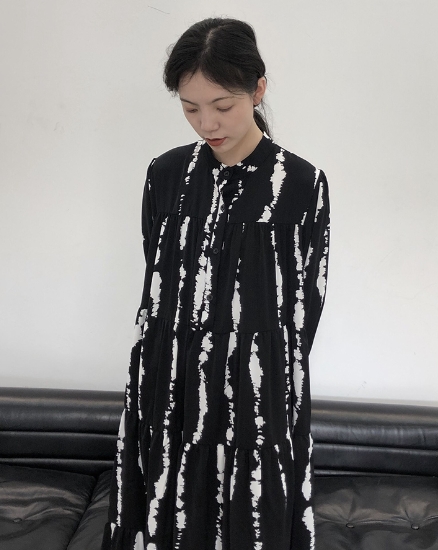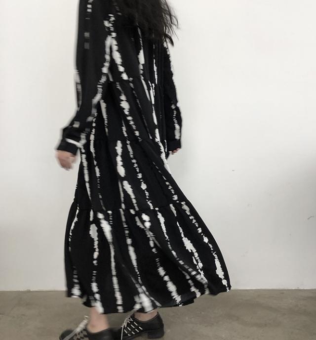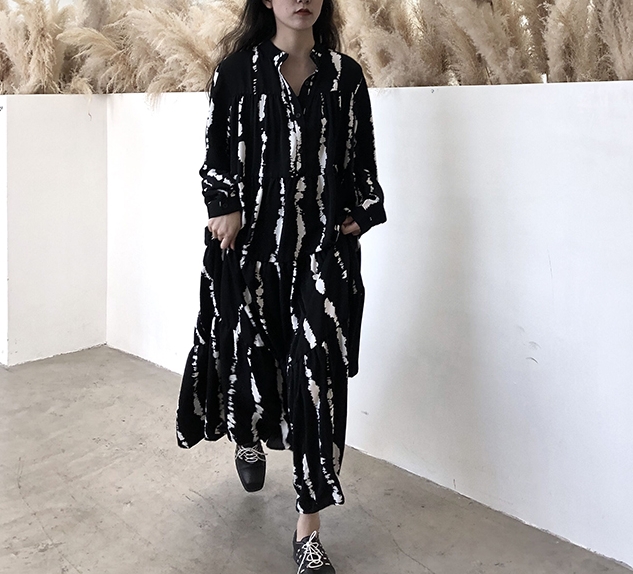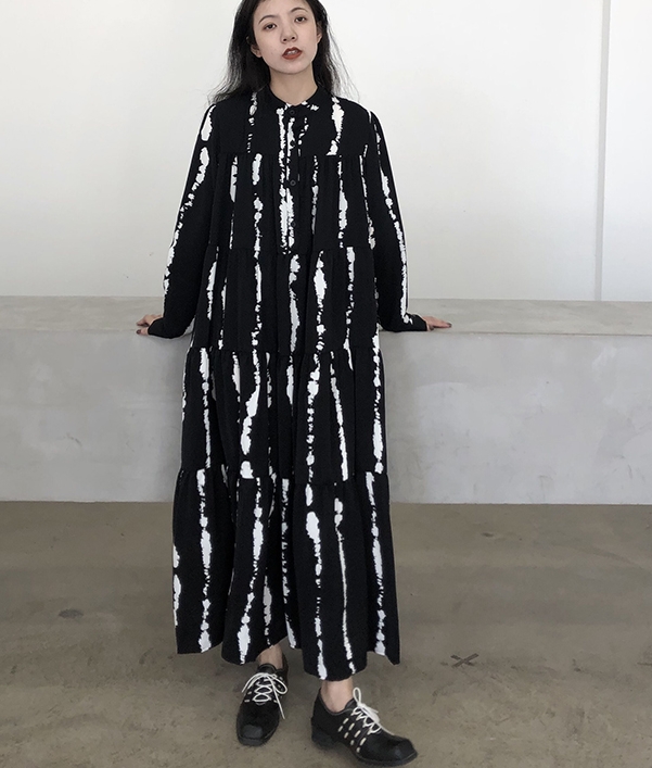 シャツワンピース ティアードワンピース ロング丈 長袖 襟なし Aライン きれいめ おしゃれ こなれ感 モード系 柄 オールシーズン デート お出かけ 普段使い 楽ちん 体系カバー ブラック モノトーン
