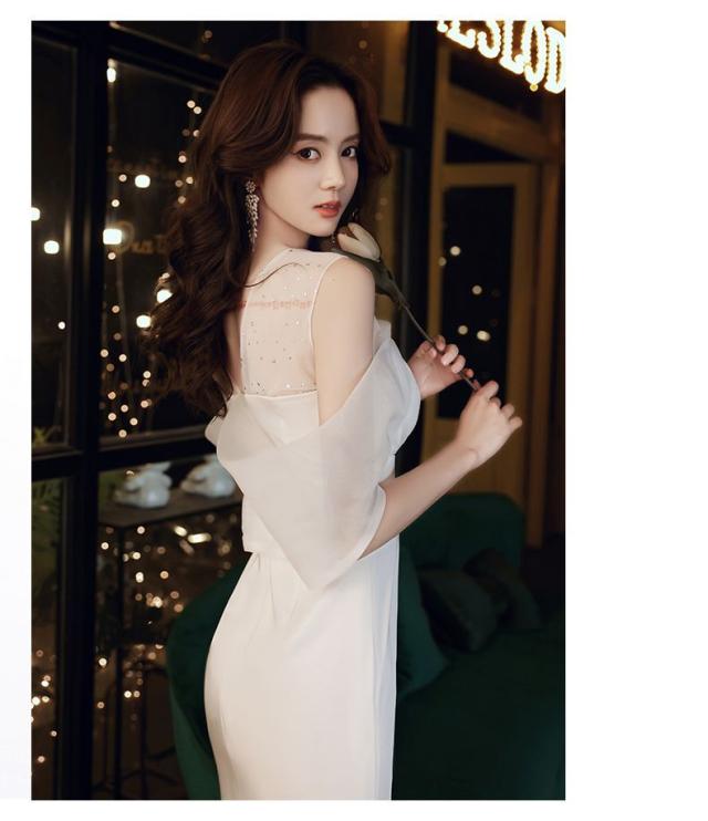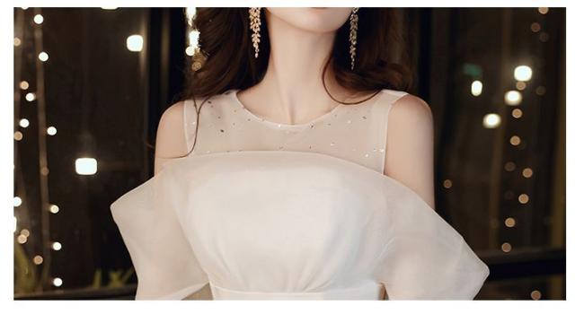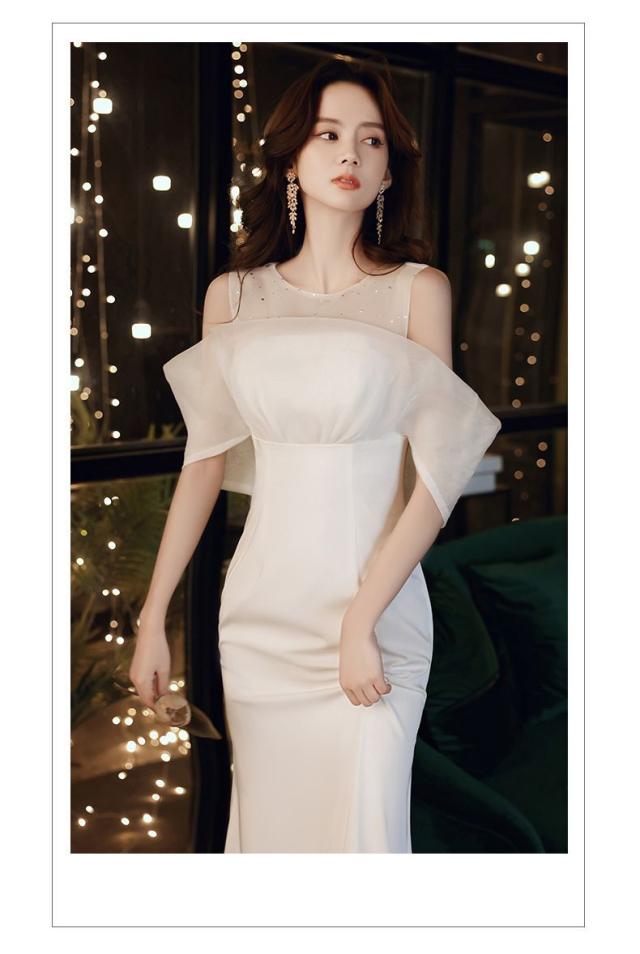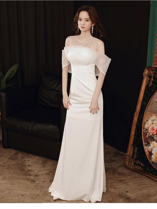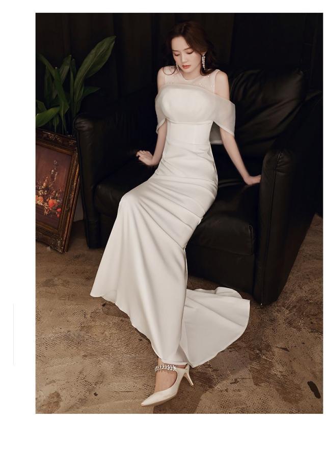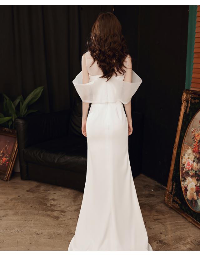 ホワイトカラーのオフショルダーマーメイドロングドレス。