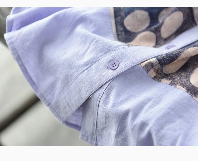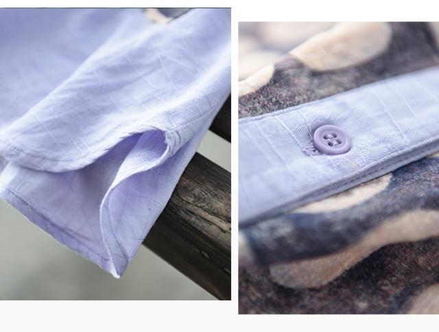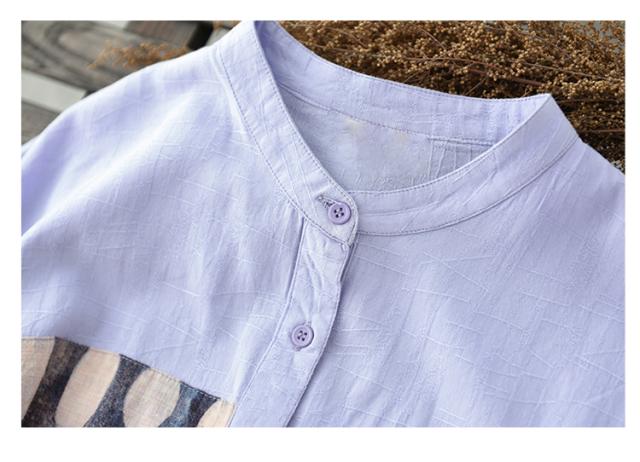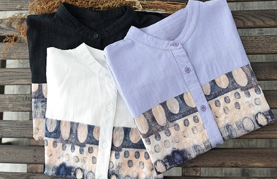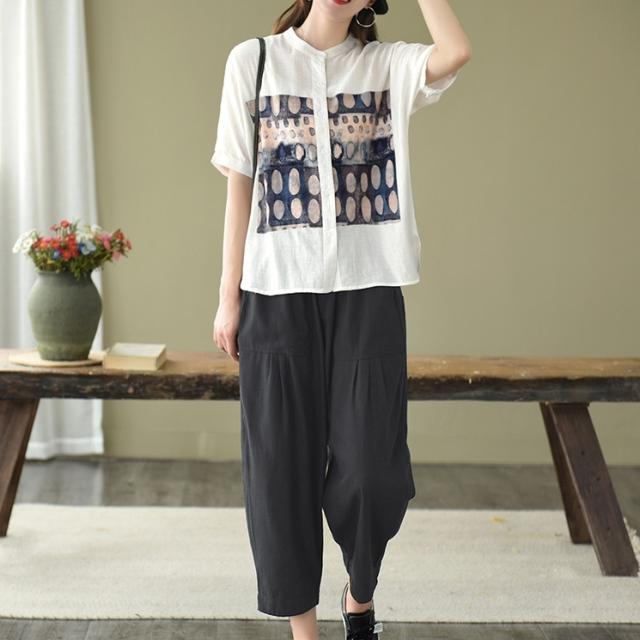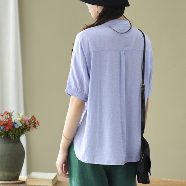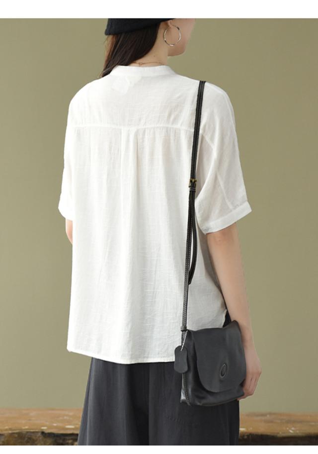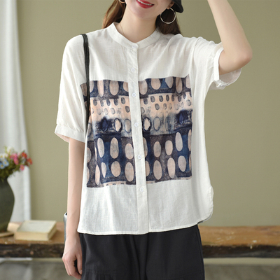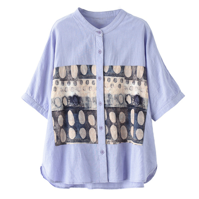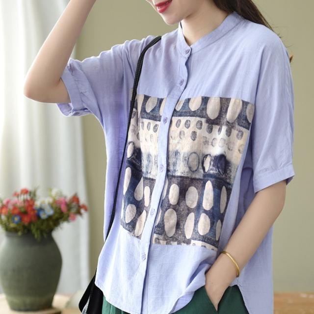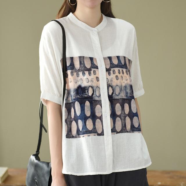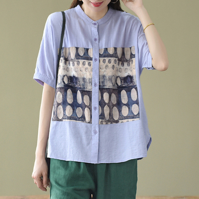 トップス ブラウス 半袖 スタンドカラー レディース ゆったり 大きめ 大きいサイズ 夏 薄手 5分袖 ワイド シャツ カットソー アート アーティスティック お洒落 オシャレ 水彩画 シンプル カジュアル ラフ クール かっこいい 30代 40代 50代 レトロ エキゾチック くすみカラー 青 ブルー 水色 白 ホワイト 黒 ブラック ボタン 前開き 個性的 個性派 こなれ感 ルーズ とろみ 体型カバー 着痩せ 細見え