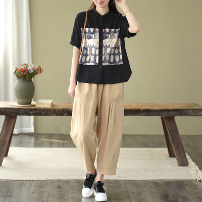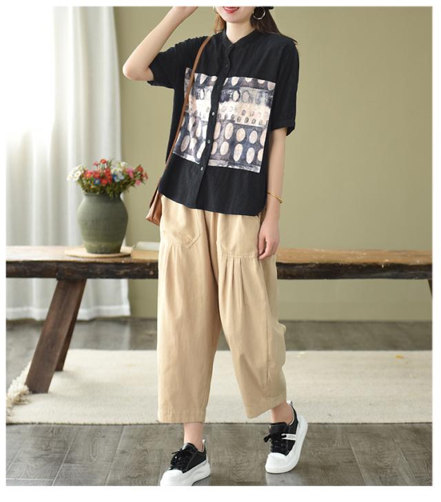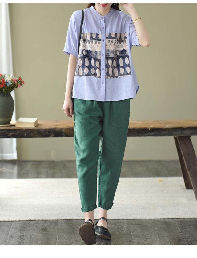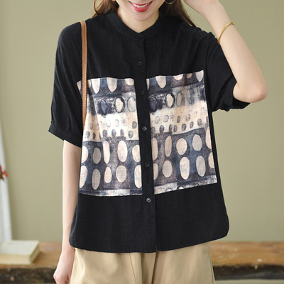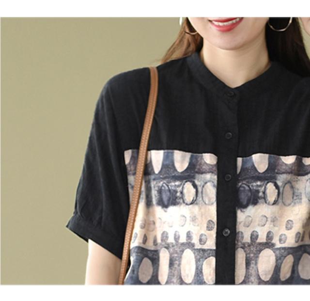 トップス ブラウス 半袖 スタンドカラー レディース ゆったり 大きめ 大きいサイズ 夏 薄手 5分袖 ワイド シャツ カットソー アート アーティスティック お洒落 オシャレ 水彩画 シンプル カジュアル ラフ クール かっこいい 30代 40代 50代 レトロ エキゾチック くすみカラー