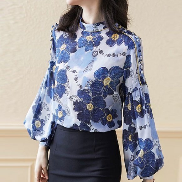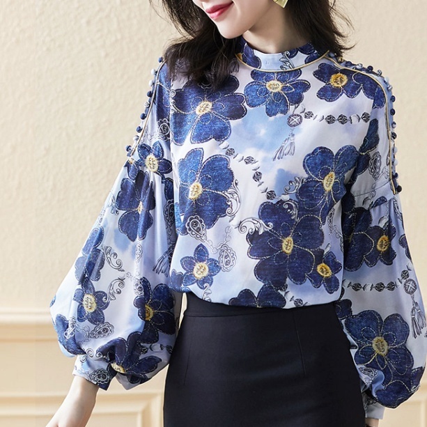 トップス ブラウス 花柄 ランタンスリーブ レディース スタンドカラー フラワー 青 ブルー シャツ カットソー ふんわり ゆったり 大きいサイズ 2XL 3XL 4XL 5XL 小さいサイズ XS エレガント 上品 ゴージャス 高級感 お洒落 オシャレ かわいい 大人可愛い ふんわり
