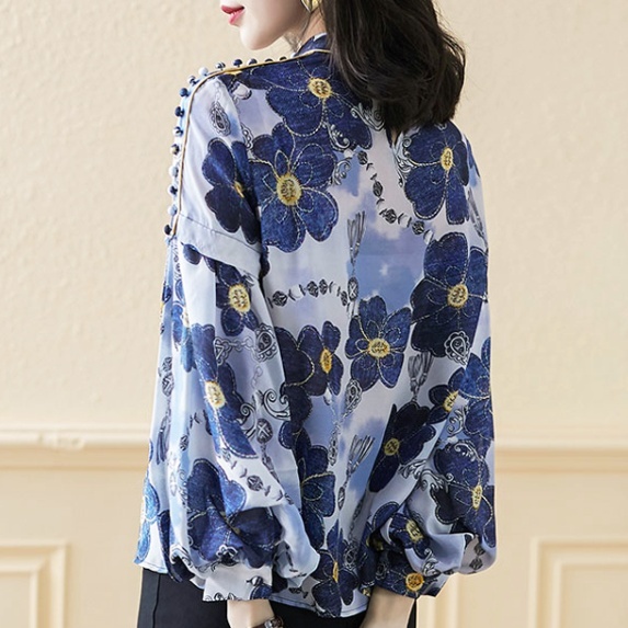 トップス ブラウス 花柄 ランタンスリーブ レディース スタンドカラー フラワー 青 ブルー シャツ カットソー ふんわり ゆったり 大きいサイズ 2XL 3XL 4XL 5XL 小さいサイズ XS エレガント 上品 ゴージャス 高級感 お洒落 オシャレ かわいい 大人可愛い ふんわり 体型カバー 細見え 着痩せ 華奢 シフォン レトロ アンティーク ヴィンテージ きれいめ 30代 40代 50代 参観日 発表会 春 秋 薄手 ボリューム ボリューム袖 シフォン 総柄