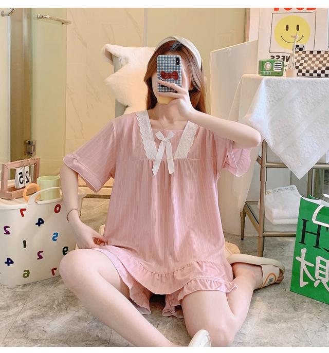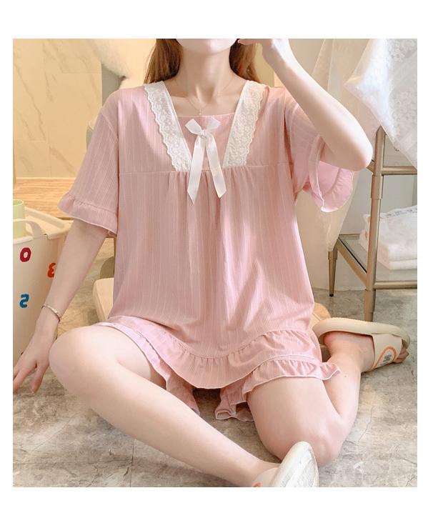 夏 半袖 ツーピース トップス パンツ ルームウェア パジャマ プルオーバー 寝巻き ナイトウェア ショートパンツ ミニ丈 ショート丈 袖あり 半袖 スクエアネック 襟なし レギュラー リボン ウエストゴム 伸縮性 レース 大人可愛い カジュアル お洒落 大人女子 キュート 無地 夏