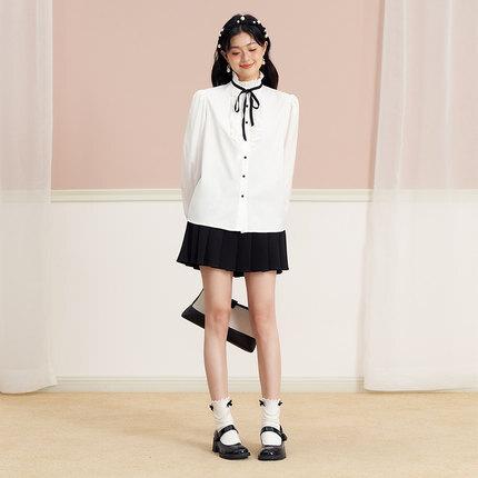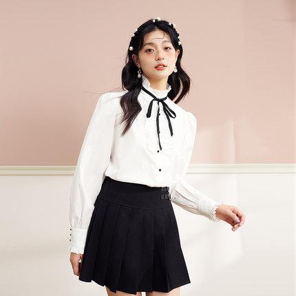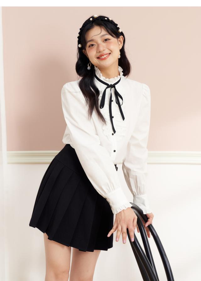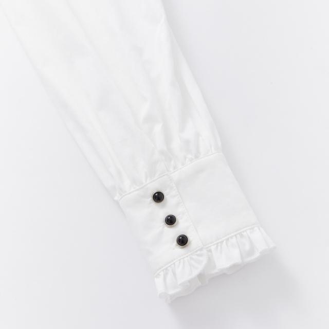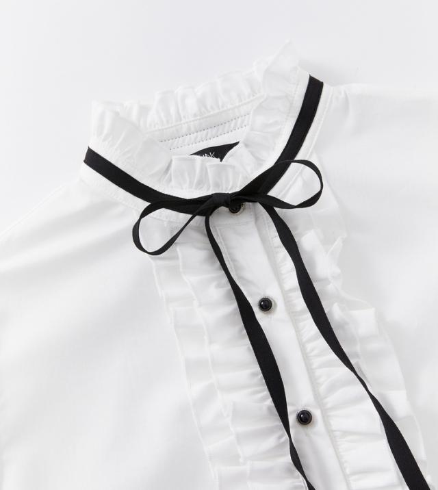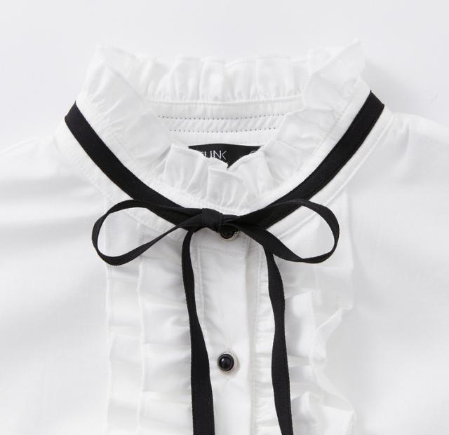 ブラウス リボン フリル 長袖 レディース 量産型 ロリータ ガーリー トップス シャツ トレンド 流行 今っぽ 韓国 ハイネック スタンドカラー パフスリーブ かわいい 大人可愛い 大人女子 春 秋 冬 白シャツ ホワイト 白 黒 ブラック モノクロ 白黒 ゴージャス エレガント キュート 清楚 上品 高級感 20代 30代 結婚式 披露宴 卒業式 入学式 パーティー デート 女子会 発表会 フォーマル 主役 存在感 こなれ感 お洒落 オシャレ 着回し ゆったり 大きめ XL