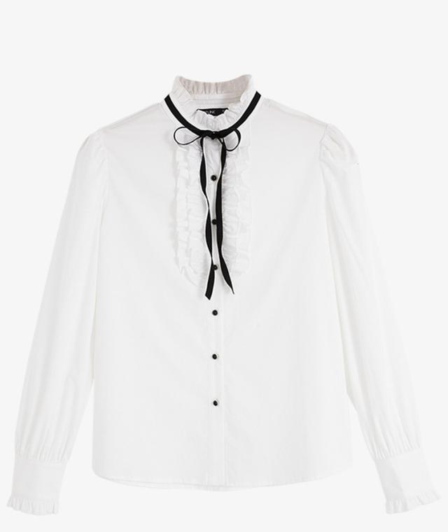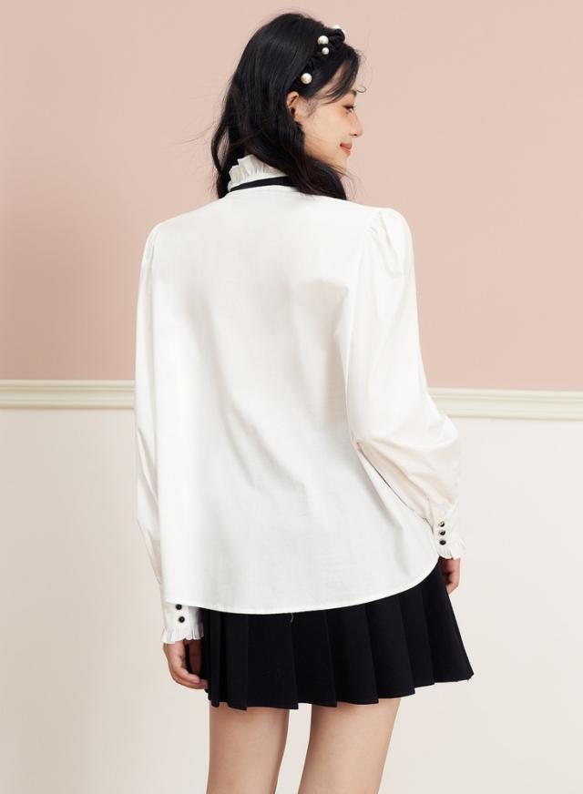 ブラウス リボン フリル 長袖 レディース 量産型 ロリータ ガーリー トップス シャツ トレンド 流行 今っぽ 韓国 ハイネック スタンドカラー パフスリーブ かわいい 大人可愛い 大人女子 春 秋 冬 白シャツ ホワイト 白 黒 ブラック モノクロ 白黒 ゴージャス エレガント