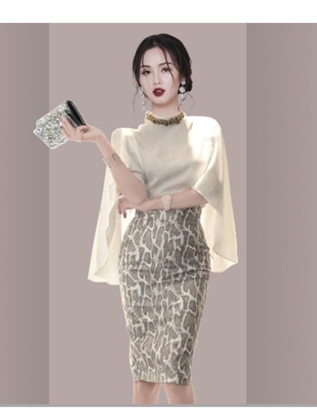 秋 スリム スーツ トップス スカート デート ニットソー 上着 ペンシルスカート タイトスカート ミディアム丈 袖あり 5分袖 タートルネック 襟なし スリム タイト 裾イン ふわふわ 透け感 異素材MIX シンプル 大人 上品 お洒落 かっこいい 大人女子 セクシー エレガント 無地 ヒョウ柄 秋 20代 30代 レディース 女性用 ママ ビジネス OL 通勤 お出かけ 女子会 休日 イベント ホテル レストラン 着回し ファッション モテ インスタ映え S M L XL ホワイト+ヒョウ柄